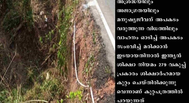 കാവുംചാൽ കനാൽ റോഡിൽ 2022മാർച്ച് 8-നു സംഭവിച്ച അപകടത്തിൽ മരിച്ച ചെങ്ങിനി ഒതയാത്ത് സി.ഒ.ഭാസ്കരന് (54) എതിരെയാണ് കുറ്റപത്രം. കോടതിയിൽ നേരിട്ടോ വക്കീൽ മുഖേനയോ ഹാജരായി പിഴ അടയ്ക്കണമെന്നു കാണിച്ച് പരേതനായ ഭാസ്കരന്റെ പേരിൽ താലൂക്ക് ലീഗൽ സർവീസസ് കമ്മറ്റിയിൽ നിന്ന് അയച്ച കത്ത് കഴിഞ്ഞ ദിവസം ലഭിച്ചപ്പോഴാണ് കുടുംബാംഗങ്ങൾ ഈ വിവരം അറിഞ്ഞത്.