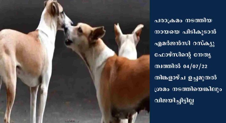പരാക്രമം നടത്തിയ നായയെ പിടികൂടാൻ എമർജൻസി റസ്ക്യു ഫോഴ്സിന്റെ നേതൃത്വത്തിൽ 04/07/22 തിങ്കളാഴ്ച ഉച്ചമുതൽ ശ്രമം നടത്തിയെങ്കിലും വിജയിച്ചിട്ടില്ല. വിവിധ സ്ഥലങ്ങളിൽ നായയെ കണ്ടെങ്കിലും അക്രമാസക്തമായതിനാൽ പിടികൂടാൻ കഴിഞ്ഞില്ല