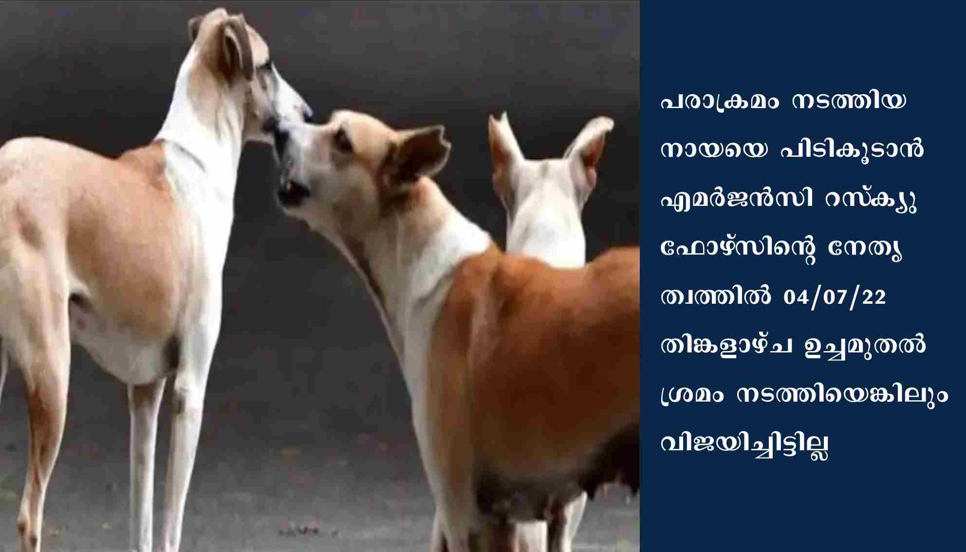 പരാക്രമം നടത്തിയ നായയെ പിടികൂടാൻ എമർജൻസി റസ്ക്യു ഫോഴ്സിന്റെ നേതൃത്വത്തിൽ 04/07/22 തിങ്കളാഴ്ച ഉച്ചമുതൽ ശ്രമം നടത്തിയെങ്കിലും വിജയിച്ചിട്ടില്ല. വിവിധ സ്ഥലങ്ങളിൽ നായയെ കണ്ടെങ്കിലും അക്രമാസക്തമായതിനാൽ പിടികൂടാൻ കഴിഞ്ഞില്ല