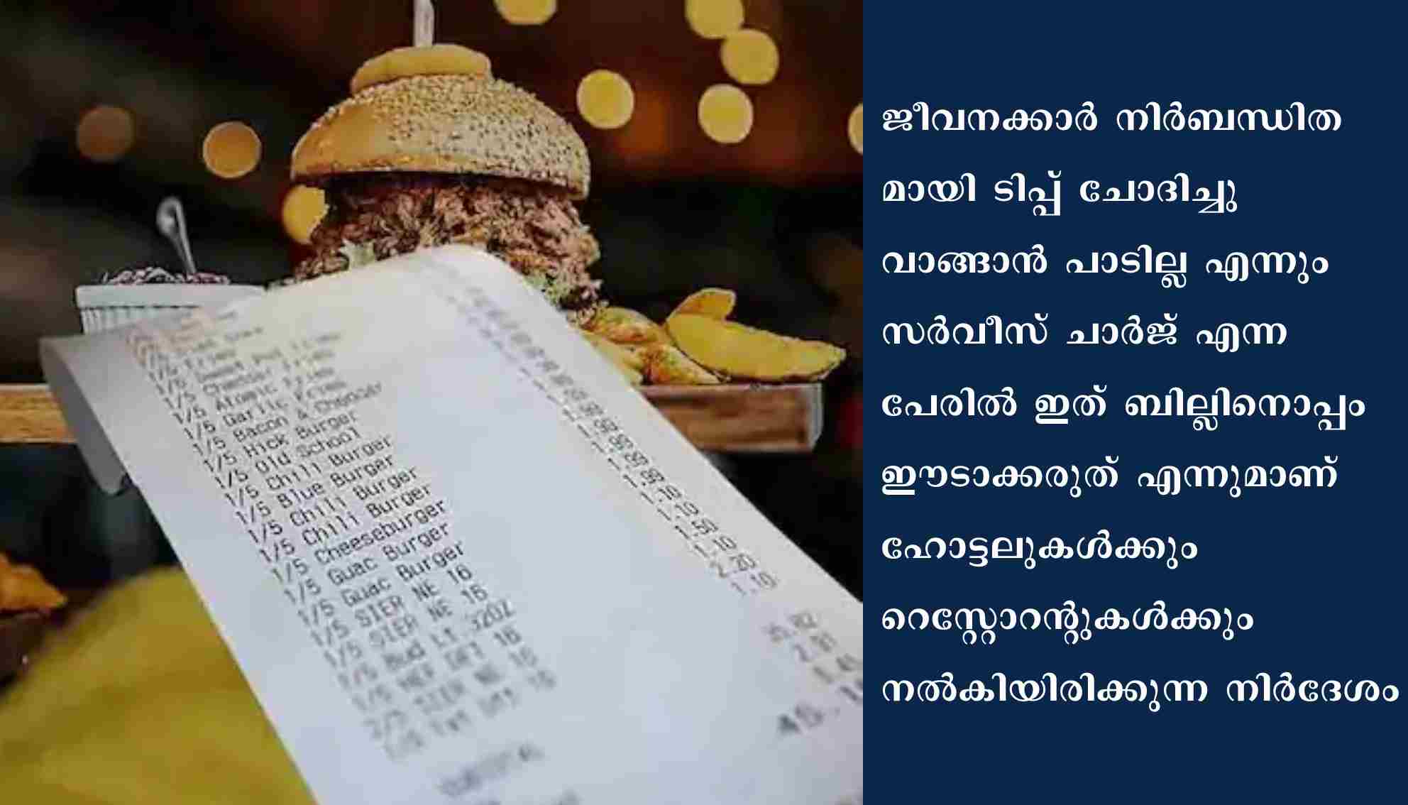 ജീവനക്കാർ നിർബന്ധിതമായി ടിപ്പ് ചോദിച്ചു വാങ്ങാൻ പാടില്ല എന്നും സർവീസ് ചാർജ് എന്ന പേരിൽ ഇത് ബില്ലിനൊപ്പം ഈടാക്കരുത് എന്നുമാണ് ഹോട്ടലുകൾക്കും റെസ്റ്റോറന്റുകൾക്കും നൽകിയിരിക്കുന്ന നിർദേശം.ദിവസങ്ങൾക്ക് മുൻപ് ഉപഭോക്തൃകാര്യ മന്ത്രാലയം റെസ്റ്റോറന്റുകളോടും ഹോട്ടലുകളോടും സർവീസ് ചാർജ് ഈടാക്കരുതെന്ന് പറഞ്ഞിരുന്നു. എന്നാൽ, വ്യക്തമായ മാർഗനിർദേശങ്ങളൊന്നും നൽകിയിരുന്നില്ല. കൂടാതെ സേവനങ്ങൾക്കുള്ള നിരക്ക് “നിയമപരമാണ്” എന്ന് നാഷണൽ റെസ്റ്റോറന്റ് അസോസിയേഷൻ ഓഫ് ഇന്ത്യ (NRAI) വാദിച്ചിരുന്നു. ഇതിനെ തുടർന്നാണ് മാർഗനിർദേശങ്ങൾ ഉപഭോക്തൃകാര്യ മന്ത്രാലയം പുറത്തിറക്കിയിരിക്കുന്നത്.