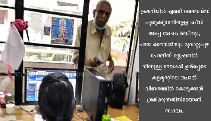 ട്രഷറിയിൽ എത്തി ലൈസൻസ് പുതുക്കുന്നതിനുള്ള ഫീസ് അടച്ച ശേഷം രസീതും, പഴയ ലൈസൻസും മൂവാറ്റുപുഴ പോലീസ് സ്റ്റേഷനിൽ നിന്നുള്ള രേഖകൾ ഉൾപ്പെടെ കളക്ടറേറ്റിലെ തപാൽ വിഭാഗത്തിൽ കൊടുക്കാൻ ശ്രമിക്കുന്നതിനിടെയാണ് സംഭവം. ബാഗിൽ നിന്ന് രേഖകൾക്കൊപ്പം തോക്കും പുറത്തെടുത്ത് ചൂണ്ടിപ്പിടിച്ചതോടെ ജീവനക്കാർ ഭയന്നു.