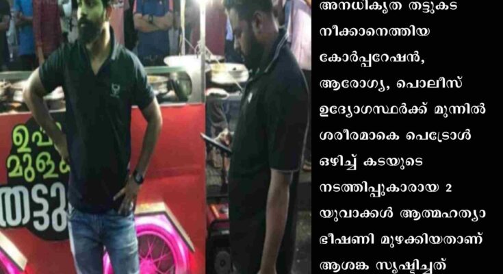 കൊച്ചി: എറണാകുളം പനമ്പള്ളി നഗറിൽ ‘ഉപ്പും മുളകും’ തട്ടുകടയ്ക്ക് മുന്നിൽ കടന്നുപോയത് ഭീതിയുടെ ഒന്നര മണിക്കൂർ. അനധികൃത തട്ടുകട നീക്കാനെത്തിയ കോർപ്പറേഷൻ, ആരോഗ്യ, പൊലീസ് ഉദ്യോഗസ്ഥർക്ക് മുന്നിൽ ശരീരമാകെ പെട്രോൾ ഒഴിച്ച് കടയുടെ നടത്തിപ്പുകാരായ രണ്ടു യുവാക്കൾ ആത്മഹത്യാ ഭീഷണി മുഴക്കിയതാണ് ആശങ്ക സൃഷ്ടിച്ചത് .ഇവരുടെ കയ്യിൽ പെട്രോൾ നിറച്ച കന്നാസുകളുമുണ്ടായിരുന്നു. ഒരു ചെറിയ തീപ്പൊരി വൻ അപകടം സൃഷ്ടിക്കുമെന്നിരിക്കെ തടിച്ചുകൂടിയ ആൾക്കൂട്ടത്തെ നിയന്ത്രിക്കാൻ ഓടിയെത്തിയ ഇരുപതിലേറെ വരുന്ന പൊലീസുകാരും പാടുപെട്ടു.