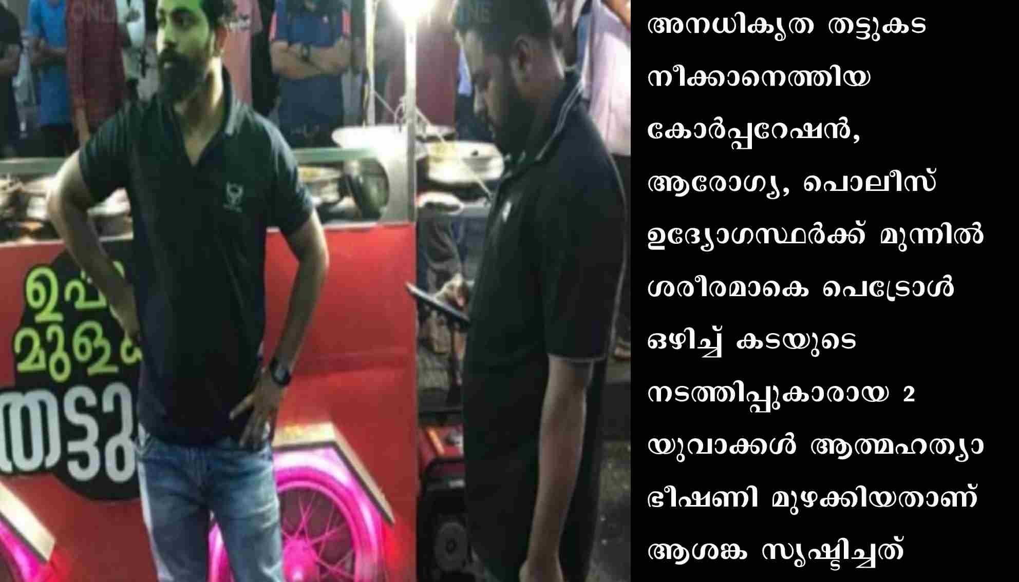 2022 ജൂലൈ 7 വ്യാഴാഴ്ച വൈകിട്ട് ആറുമണിയോടെയാണ് സംഭവങ്ങൾക്ക് തുടക്കം. ഇവിടെ തട്ടുകട നടത്തുന്നതിന് കോർപ്പറേഷൻ ലൈസൻസ് നൽകിയിട്ടുള്ള ആൾ സ്ഥലത്തില്ലെന്നും കട കോർപ്പറേഷൻ വാഹനത്തിൽ എടുത്തു കൊണ്ടുപോകുമെന്നും ഉദ്യോഗസ്ഥർ അറിയിച്ചു. ഇതോടെ നിരത്തിവച്ചിരിക്കുന്ന ഭക്ഷണ സാധനങ്ങളെയും കഴിക്കാനെത്തിയ ആളുകളെയും സാക്ഷി നിർത്തി ‘കട എടുക്കാൻ ശ്രമിച്ചാൽ കത്തിക്കും’ എന്ന് യുവാക്കൾ ഭീഷണി മുഴക്കുകയായിരുന്നു. ലൈസൻസിയുടെ ബന്ധുക്കളെന്ന് അവകാശപ്പെടുന്ന മലപ്പുറം നിലമ്പൂർ കരുവാരകുണ്ട് സ്വദേശി ഹബീബ് റഹ്മാനും കാളികാവ് സ്വദേശി സിൻസാറുമാണ് ആത്മഹത്യാ ഭീഷണി മുഴക്കിയത്.