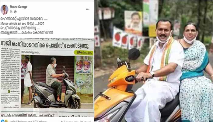 സ്കൂട്ടറിൽ ഹെൽമെറ്റില്ലാതെ യാത്ര ചെയ്യുന്ന സജി ചെറിയാന്റെ ചിത്രം ചൂണ്ടിക്കാട്ടിയാണ് ഷോണിന്റെ വിമർശനം. ഹെൽമറ്റ് ഇല്ലാതെ വാഹനം ഓടിച്ചതിന് പിഴയടക്കണമെന്നും അല്ലെങ്കിൽ കോടതി കാണണമെന്നും ഷോൺ ജോർജ് ഫേസ്ബുക്കിൽ കുറിച്ചു. ഷോണിൻറെ ഫേസ്ബുക്ക് പോസ്റ്റ് ഇങ്ങനെയാണ് ” ഹെൽമറ്റ് എവിടെ സഖാവേ, മോട്ടോർ വെഹിക്കിൾ ആക്ട് സെക്ഷൻ 194 ഡി പ്രകാരം 500 രൂപ പെറ്റി അടച്ചേ മതിയാകൂ അല്ലെങ്കിൽ ശേഷം കോടതിയിൽ”.