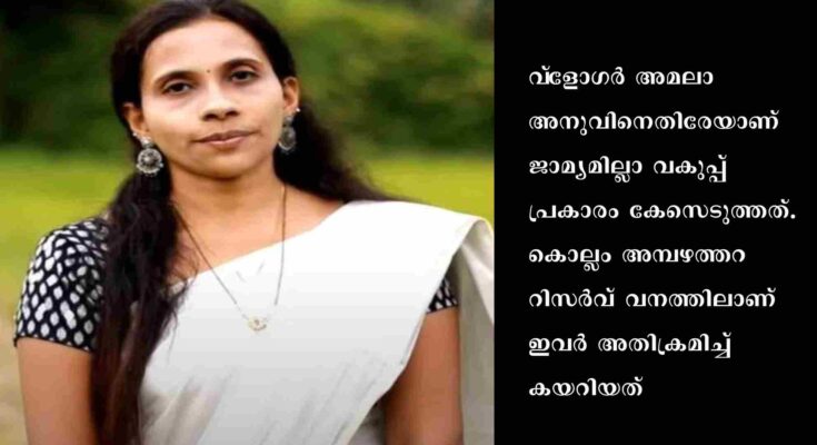 കൊല്ലം: കാട്ടിൽ അതിക്രമിച്ചു കയറിയ വനിതാ വ്ളോഗർക്കെതിരേ വനംവകുപ്പ് കേസെടുത്തു. വ്ളോഗർ അമലാ അനുവിനെതിരേയാണ് ജാമ്യമില്ലാ വകുപ്പ് പ്രകാരം കേസെടുത്തത്. കൊല്ലം അമ്പഴത്തറ റിസർവ് വനത്തിലാണ് ഇവർ അതിക്രമിച്ച് കയറിയത്.