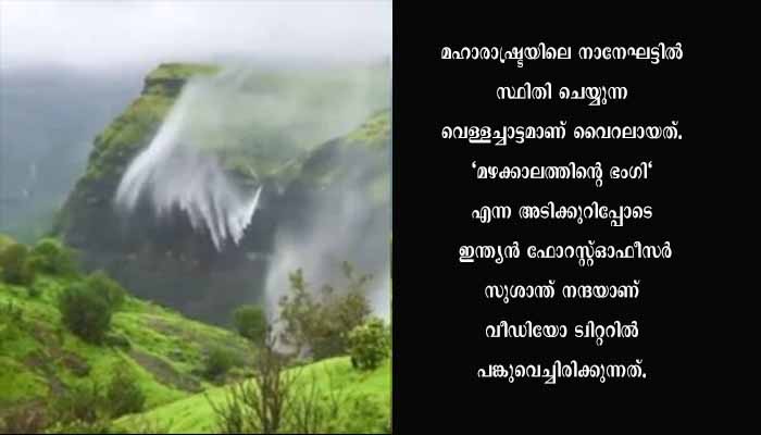 നാനേഘട്ടി റിവേഴ്സ് വെള്ളച്ചാട്ടത്തിലെ വെള്ളം ഭൂമിയിൽ പതിക്കുന്നതിനു പകരം പോകുന്നത് ആകാശത്തേക്ക് ആണ്. ന്യൂട്ടന്റെ ഗുരുത്വാകർഷണ നിയമത്തിനൊന്നും ഇവിടെ പ്രസക്തിയില്ല. മഴയ്ക്കൊപ്പമുള്ള കാറ്റാണ് ഈ മനോഹരമായ ദൃശ്യം സാധ്യമാക്കുന്നത്. “മഴക്കാലത്തിന്റെ ഭംഗി” എന്ന അടിക്കുറിപ്പോടെ ഇന്ത്യൻ ഫോറസ്റ്റ് ഓഫീസർ സുശാന്ത് നന്ദയാണ് വീഡിയോ ട്വിറ്ററിൽ പങ്കുവെച്ചിരിക്കുന്നത്.