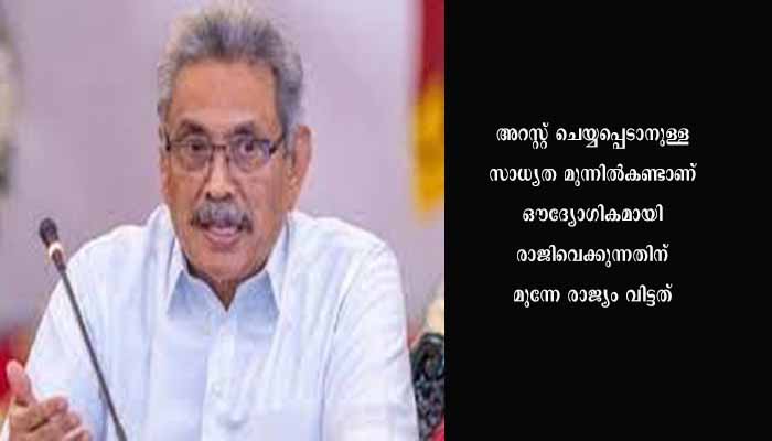 13/07/22 ബുധനാഴ്ച രാജിവെക്കും എന്ന് രാജപക്സെ നേരത്തെ പ്രഖ്യാപിച്ചിരുന്നു. അറസ്റ്റ് ചെയ്യപ്പെടാനുള്ള സാധ്യത മുന്നിൽകണ്ടാണ് ഔദ്യോഗികമായി രാജിവെക്കുന്നതിന് മുന്നേ രാജ്യം വിട്ടത്. കഴിഞ്ഞ ദിവസം ദുബായിലേക്ക് കടക്കാൻ ശ്രമിച്ച ഗോതബയയെ അന്താരാഷ്ട്ര വിമാനത്താവളത്തിൽ ഇമിഗ്രേഷൻ ഉദ്യോഗസ്ഥർ തടഞ്ഞിരുന്നു. 09/07/22 ശനിയാഴ്ച പ്രസിഡന്റിന്റെ വസതിയിലേക്ക് പതിനായിരക്കണക്കിന് പ്രക്ഷോഭകാരികൾ ഇരച്ചു കയറുന്നതിന് മുന്നേ ഗോതബയയെ സൈന്യം രഹസ്യ കേന്ദ്രത്തിലേക്ക് മാറ്റിയിരുന്നു. രാജിവയ്ക്കാതെ കൊട്ടാരം വിടില്ലെന്നാണ് പ്രക്ഷോഭകർ പറയുന്നത്.
