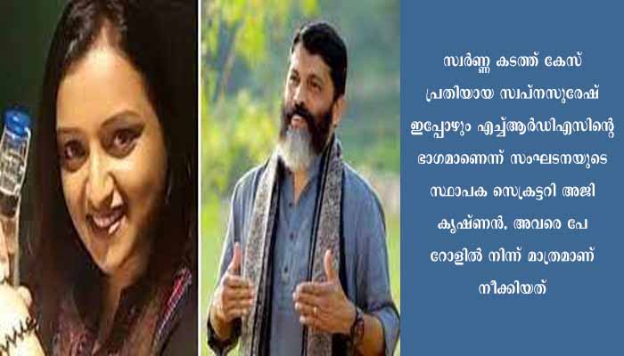 പാലക്കാട്: സ്വർണ്ണക്കടത്ത് കേസ് പ്രതിയായ സ്വപ്നസുരേഷ് ഇപ്പോഴും എച്ച്ആർഡിഎസിന്റെ ഭാഗമാണെന്ന് സംഘടനയുടെ സ്ഥാപക സെക്രട്ടറി അജി കൃഷ്ണൻ. അവരെ പേ റോളിൽ നിന്ന് മാത്രമാണ് നീക്കിയത്. സംഘടനയ്ക്ക് വിദേശഫണ്ട് ലഭിക്കാൻ സ്വപ്നസുരേഷിന്റെ സഹായം അത്യാവശ്യമാണ്. അതിനാൽ അവർക്ക് സംഘടനയിൽ ഉന്നത പദവി നൽകി ഒപ്പം നിർത്തിയിരിക്കുകയാണെന്നും അജികൃഷ്ണൻ പറഞ്ഞു. എച്ച്ആർഡിഎസിനെ സംസ്ഥാന സർക്കാർ വേട്ടയാടുകയാണെന്നും സെക്രട്ടറി പറഞ്ഞു.