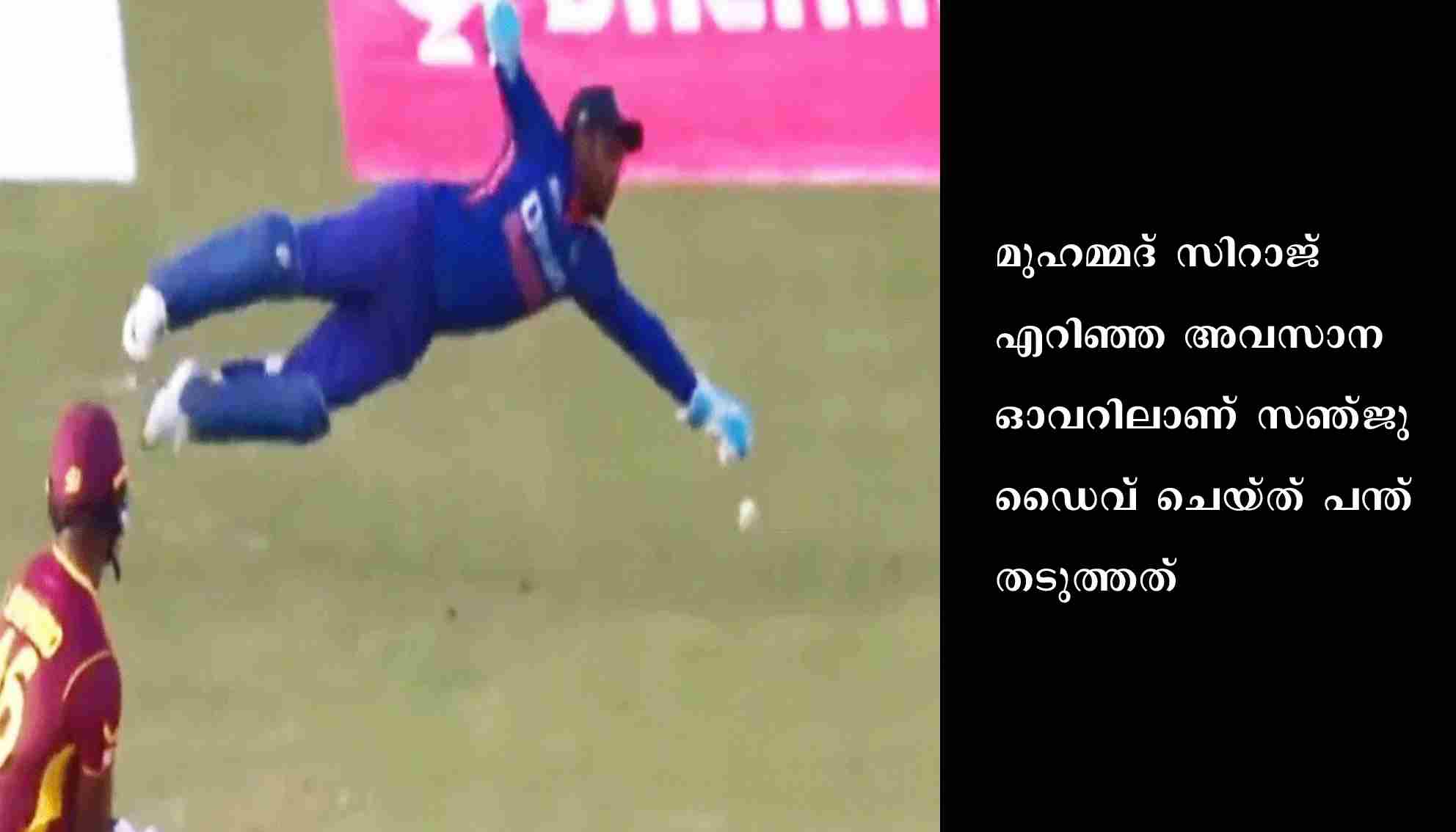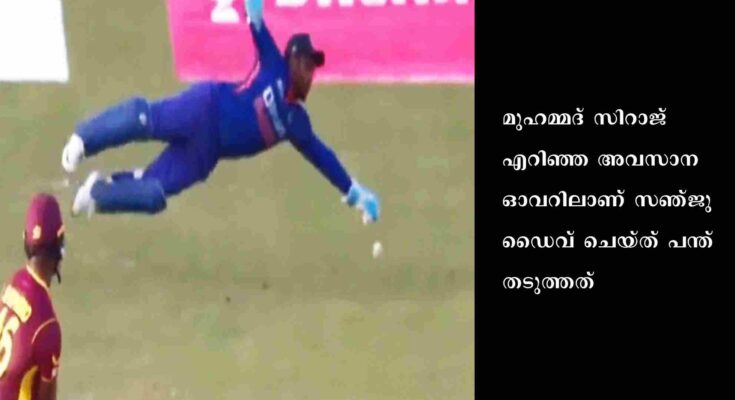ആദ്യ പന്തില്‍ അകീല്‍ ഹുസൈന് റണ്ണൊന്നും നേടാനായില്ല. രണ്ടാം പന്തില്‍ ലെഗ്‌ബൈയിലൂടെ ഒരു റണ്‍. മൂന്നാം പന്തില്‍ സ്‌ട്രൈക്ക് കിട്ടിയ റൊമാരിയോ ഷെപ്പേര്‍ഡ് പന്ത് അതിര്‍ത്തി കടത്തി. നാലാം പന്തില്‍ ഷെപ്പേര്‍ഡ് രണ്ടു റണ്‍സെടുത്തു. ഇതോടെ അവസാന രണ്ടു പന്തില്‍ വിജയത്തിലേക്ക് എട്ടു റണ്‍ എന്ന നിലയിലായി. പിന്നാലെയെറിഞ്ഞ പന്തിലായിരുന്നു സഞ്ജു ടീമിന്റെ രക്ഷകനായത്. സിറാജ്, ഷെപ്പേര്‍ഡിനെതിരേ എറിഞ്ഞ പന്ത് ലെഗ് സൈഡിലൂടെ വൈഡായി പുറത്തേക്ക്. ഈ പന്ത് അതിര്‍ത്തി കടക്കുമെന്ന് ഉറപ്പിച്ചിരിക്കേയാണു സഞ്ജു മുഴുനീള ഡൈവിലൂടെ സഞ്ജു തടഞ്ഞിട്ടത്. ഈ പന്തില്‍ വിന്‍ഡീസ് ബാറ്റര്‍മാര്‍ ഓടി റണ്ണെടുത്തില്ല. വീണ്ടുമെറിഞ്ഞ അഞ്ചാം പന്തിലും ഷെപ്പേഡ് രണ്ട് റണ്ണെടുത്തു. അതോടെ അവസാന പന്തില്‍ ജയിക്കാന്‍ അഞ്ച് റണ്‍ വേണമെന്നായി. അവസാന പന്തും ഷെപ്പേഡിനെ മറികടന്ന് സഞ്ജുവിന്റെ പക്കലേക്ക്. ബൈ ആയി ലഭിച്ച ഒരു റണ്‍ മാത്രമായിരുന്നു അതില്‍ വിന്‍ഡീസിന്റെ നേട്ടം.