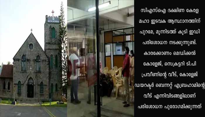 സിഎസ്ഐ ദക്ഷിണ കേരള മഹാ ഇടവക ആസ്ഥാനത്തിന് പുറമേ, മൂന്നിടത്ത് കൂടി ഇഡി പരിശോധന നടക്കുന്നുണ്ട്. കാരക്കോണം മെഡിക്കൽ കോളേജ്, സെക്രട്ടറി ടി.പി പ്രവീണിന്റെ വീട്, കോളേജ് ഡയറക്ടർ ബെന്നറ്റ് എബ്രഹാമിന്റെ വീട് എന്നിവിടങ്ങളിലാണ് പരിശോധന പുരോഗമിക്കുന്നത്. അതേസമയം പ്രവീൺ വീട്ടിലില്ലെന്നാണ് വിവരം. ചെന്നൈയിലേക്ക് പോയി എന്നാണ് വീട്ടിൽ ഉള്ളവർ എൻഫോഴ്സ്മെന്റിനെ അറിയിച്ചത്.
