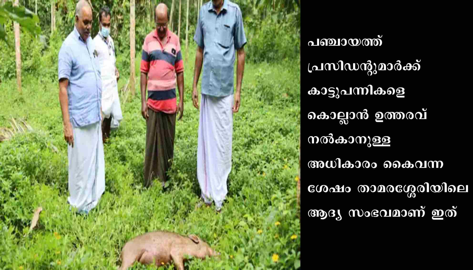 താമരശ്ശേരി ഗ്രാമപഞ്ചായത്ത് പ്രസിഡൻറ് ജെ.ടി. അബ്ദ റഹിമാൻ മാസ്റ്റർ, സംയുക്ത കർഷക കൂട്ടായ്മ ചെയർമാൻ കെ.വി. സെബാസ്റ്റ്യൻ എന്നിവരുടെ സാന്നിദ്ധ്യത്തിൽ കാട്ടുപന്നിയെ സംസ്ക്കരിച്ചു. കോഴിക്കോട് ജില്ലയുടെ മലയോര മേഖലകളിൽ കാട്ടുപന്നികൾ കൃഷി നശിപ്പിക്കുന്നത് പതിവാകുകയാണ്. വനപ്രദേശത്തിനോട് അടുത്തുള്ള കൃഷിയിടങ്ങളിൽ മാത്രമല്ല, ജനവാസ കേന്ദ്രങ്ങളിൽ കൃഷി ചെയ്താലും കാട്ടുപന്നികൾ കൂട്ടത്തോടെ വന്ന് നശിപ്പിക്കുകയാണെന്ന് കർഷകർ പറയുന്നു.