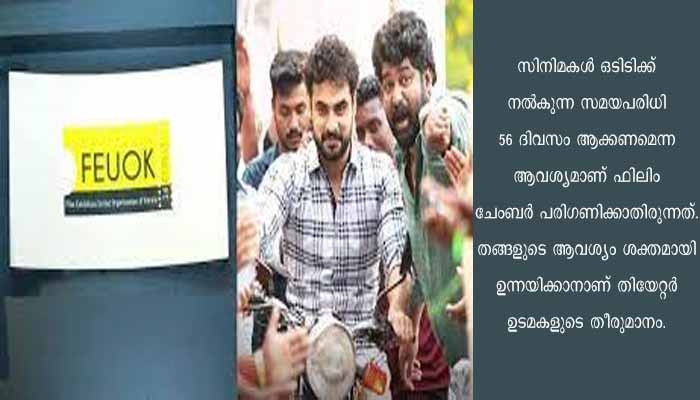 കൊച്ചി: ഒടിടി പ്ലാറ്റ് ഫോമുകളെ നിയന്ത്രണിക്കണമെന്ന ആവശ്യം ഉന്നയിച്ച് തീയേറ്റർ ഉടമകളുടെ സംഘടനയായ ഫിയോക്. ചിത്രം ഒടിടിയ്ക്ക് നൽകുന്ന സമയപരിധി വർധിപ്പിക്കണം എന്നാണ് സംഘടനയുടെ ആവശ്യം. 26/07/22 ചൊവ്വാഴ്ച കൊച്ചിയിൽ ചേരുന്ന യോഗത്തിൽ ഇക്കാര്യം തിയേറ്റർ ഉടമകൾ അവതരിപ്പിക്കും.