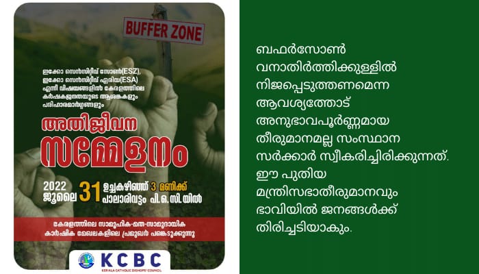 ബഫര് സോണ് വനാതിര്ത്തിക്കുള്ളില് നിജപ്പെടുത്തണമെന്ന ആവശ്യത്തോട് അനുഭാവപൂര്ണ്ണമായ തീരുമാനമല്ല സംസ്ഥാന സര്ക്കാര് സ്വീകരിച്ചിരിക്കുന്നത്. ഈ പുതിയ മന്ത്രിസഭാതീരുമാനവും ഭാവിയില് ജനങ്ങള്ക്ക് തിരിച്ചടിയാകും. വനാതിര്ത്തി പുനര്നിര്ണ്ണയിച്ച് വനത്തിനുള്ളില് ബഫര്സോണ് നിജപ്പെടുത്തുകയാണ് വേണ്ടത്.