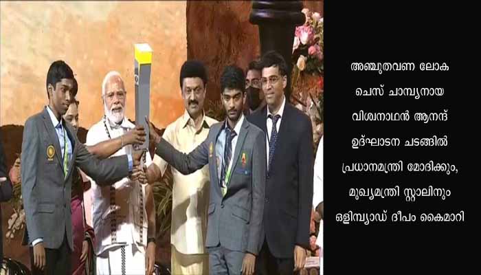 ചെന്നൈ: 44-ാമത് അന്താരാഷ്ട്ര ചെസ്സ് ഒളിമ്പ്യാഡ് ചെന്നൈയിൽ തമിഴ്നാട് മുഖ്യമന്ത്രി എം. കെ സ്റ്റാലിന്റെ സാന്നിധ്യത്തിൽ പ്രധാനമന്ത്രി നരേന്ദ്രമോദി ഉദ്ഘാടനം ചെയ്തു. അഞ്ചുതവണ ലോക ചെസ് ചാമ്പ്യനായ വിശ്വനാഥൻ ആനന്ദ് ഉദ്ഘാടന ചടങ്ങിൽ പ്രധാനമന്ത്രി മോദിക്കും, മുഖ്യമന്ത്രി സ്റ്റാലിനും ഒളിമ്പ്യാഡ് ദീപം കൈമാറി. തുടർന്ന് ടോർച്ച് ഇന്ത്യൻ താരങ്ങൾക്ക് കൈമാറി.