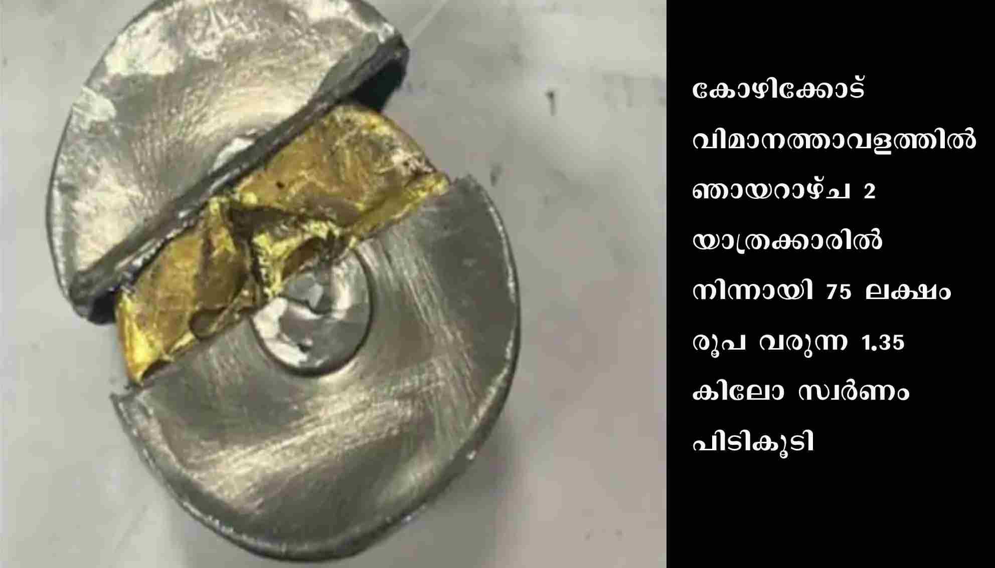 കോഴിക്കോട്: കോഴിക്കോട് വിമാനത്താവളത്തിൽ ഞായറാഴ്ച രണ്ട് യാത്രക്കാരിൽ നിന്നായി 75 ലക്ഷം രൂപ വരുന്ന 1.35 കിലോ സ്വർണം പിടികൂടി. ദുബായിൽ നിന്ന് എത്തിയ രണ്ട് യാത്രക്കാരിൽ നിന്നാണ് കസ്റ്റംസ് പ്രിവന്റീവ് വിഭാഗം ഇത്രയും സ്വർണം പിടികൂടിയത്. രഹസ്യ വിവരത്തിന്റെ അടിസ്ഥാനത്തിൽ നടത്തിയ പരിശോധനയിൽ കോഴിക്കോട് സ്വദേശിയായ അബ്ദുൽ മജീദിന്റെ ലഗേജിൽ എക്സോസ്റ്റ് ഫാനിന്റെ ആർമേച്ചറിനകത്തായി ഒളിപ്പിച്ച നിലയിലാണ് 578.69 ഗ്രാം സ്വർണം കണ്ടെടുത്തത്. ഭാരത്തിലുള്ള വ്യത്യാസം മൂലം സംശയം തോന്നുകയും കട്ടിങ് മെഷീന്റെ സഹായത്തോടെ പൊളിച്ചെടുക്കുകയും ചെയ്താണ് സ്വർണം കണ്ടെടുത്തത്.