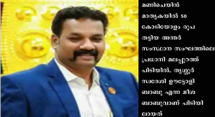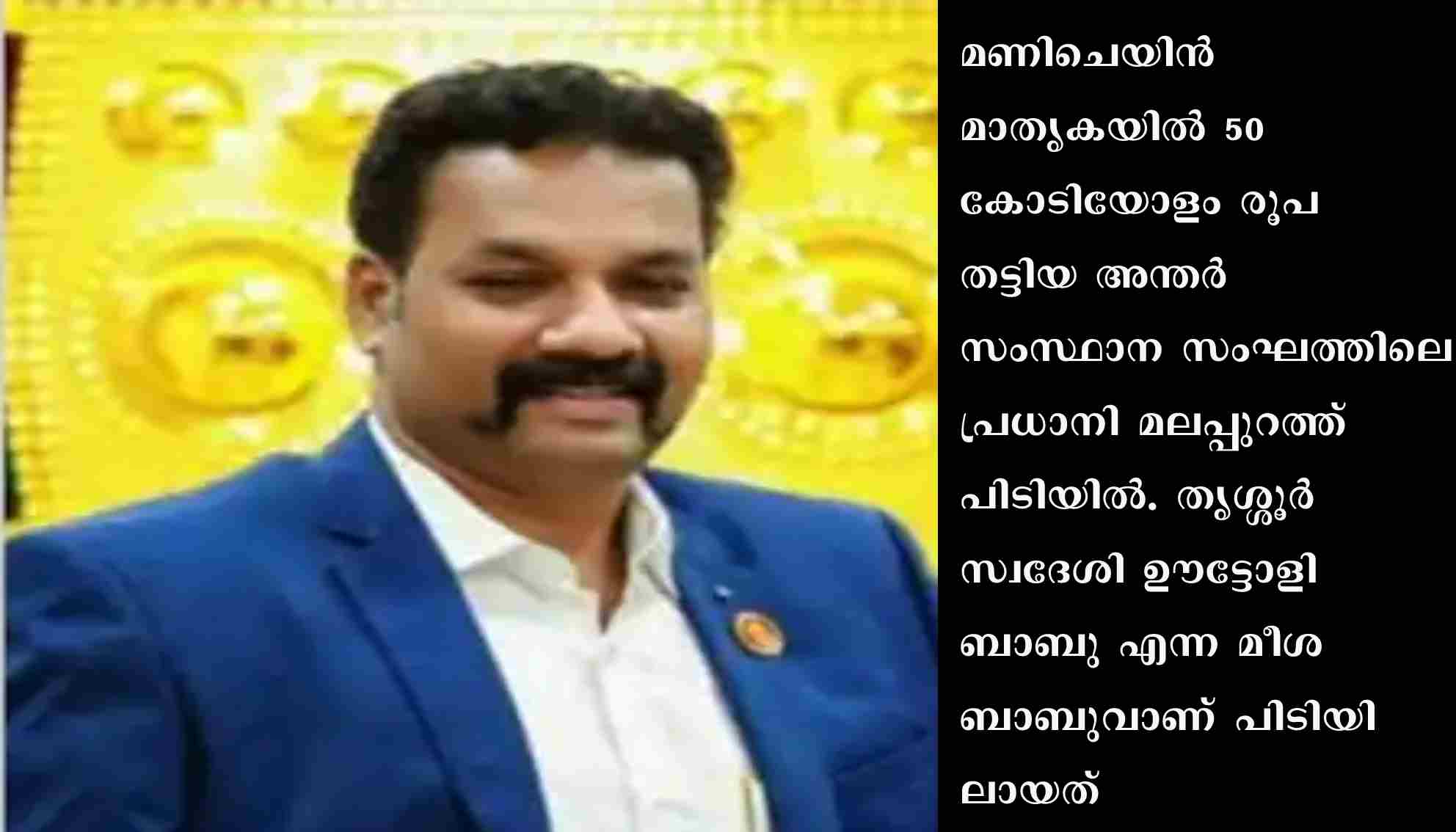 മലപ്പുറം: മണിചെയിൻ മാതൃകയിൽ 50 കോടിയോളം രൂപ തട്ടിയ അന്തർ സംസ്ഥാന സംഘത്തിലെ പ്രധാനി മലപ്പുറത്ത് പിടിയിൽ. തൃശ്ശൂർ സ്വദേശി ഊട്ടോളി ബാബു എന്ന മീശ ബാബുവാണ് പിടിയിലായത്. കേരളത്തിലെ വിവിധ ജില്ലകളും തമിഴ്നാട്, ബംഗാൾ സംസ്ഥാനങ്ങളും കേന്ദ്രീകരിച്ചായിരുന്നു തട്ടിപ്പ്. ആയിരക്കണക്കിന് ആളുകൾ തട്ടിപ്പിന് ഇരയായി എന്നാണ് പൊലീസിന് ലഭിച്ച വിവരം. കൊണ്ടോട്ടി സ്വദേശിയുടെ 23 ലക്ഷത്തോളം രൂപ തട്ടിയെടുത്തെന്ന പരാതിയിൽ നടത്തിയ അന്വേഷണത്തിലാണ് അന്തർ സംസ്ഥാന തട്ടിപ്പു സംഘത്തെ കുറിച്ച് സൂചന ലഭിച്ചത്.