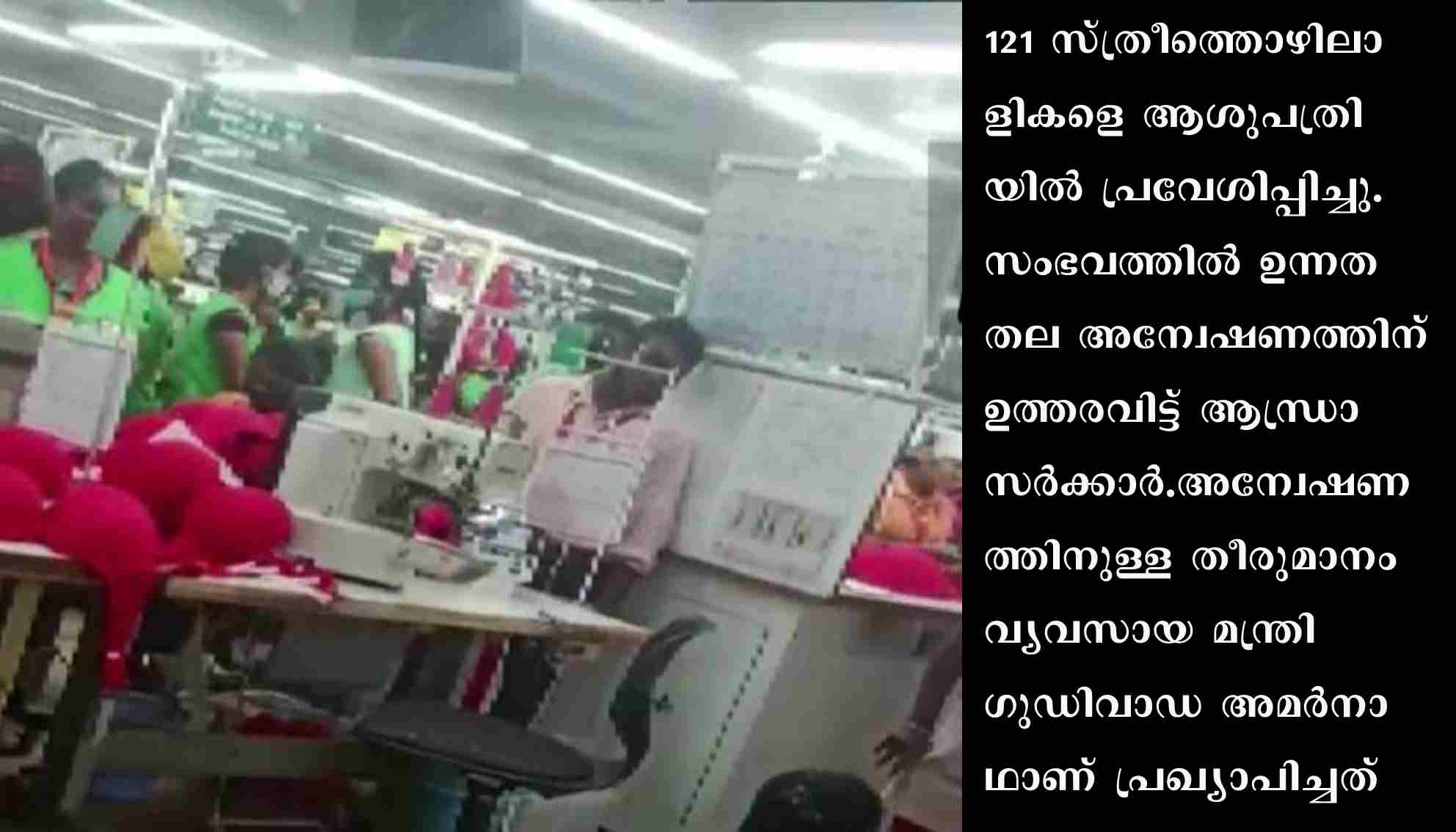 അനകപ്പള്ളി (ആന്ധ്രാപ്രദേശ്): അനകപ്പള്ളി ജില്ലയിലെ വസ്ത്രനിര്മാണശാലയില് വാതകചോര്ച്ച. 121 സ്ത്രീത്തൊഴിലാളികളെ ആശുപത്രിയില് പ്രവേശിപ്പിച്ചു. സംഭവത്തില് ഉന്നതതല അന്വേഷണത്തിന് ഉത്തരവിട്ട് ആന്ധ്രാ സര്ക്കാര്.അന്വേഷണത്തിനുള്ള തീരുമാനം വ്യവസായ മന്ത്രി ഗുഡിവാഡ അമര്നാഥാണ് പ്രഖ്യാപിച്ചത്. അന്വേഷണം പൂര്ത്തിയാകുംവരെ കമ്പനി അടച്ചിടും. കഴിഞ്ഞ രണ്ട് മാസത്തിനിടെ രണ്ടാമത്തെ വാതക ചോര്ച്ചയാണിതെന്നും മന്ത്രി ചൂണ്ടിക്കാട്ടി.ജൂണില് വിശാഖപട്ടണത്തെ അച്യുതപുരത്തുള്ള ലബോറട്ടറിയില് വാതക ചോര്ച്ചയുണ്ടായി. അന്ന് 178 സ്ത്രീ തൊഴിലാളികളാണ് രോഗബാധിതരായത്. തുടര്ന്ന് ചോര്ച്ചയുടെ കാരണം കണ്ടെത്താന് സര്ക്കാര് സംയുക്ത സമിതി രൂപീകരിച്ചിരുന്നു.