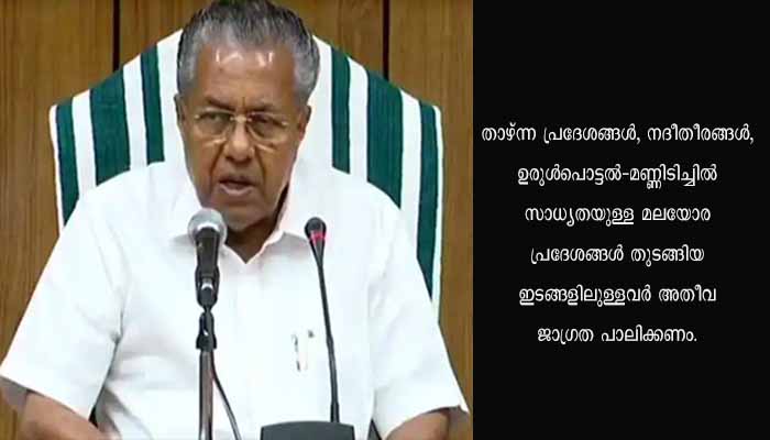 തൃശൂര് : മഴ ശക്തമായി തുടരുന്ന സാഹചര്യത്തില് ചാലക്കുടി പുഴയില് വൈകിട്ടോടെ കൂടുതല് ജലം എത്തിച്ചേരുമെന്നാണ് വിലയിരുത്തല്. വെള്ളമുയരുമെന്ന മുന്നറിയിപ്പുള്ളതിനാല് പ്രദേശവാസികള് ജാഗ്രത പാലിക്കുകയും അധികൃതരുടെ നിര്ദേശങ്ങള് അനുസരിച്ച് മാറിത്താമസിക്കാന് തയ്യാറാകണമെന്നും മുഖ്യമന്ത്രി പിണറായി വിജയന് നിര്ദ്ദേശിച്ചു. തൃശ്ശൂര്, എറണാകുളം ജില്ലകളുടെ താഴ്ന്ന പ്രദേശങ്ങളിലുള്ളവരും ജാഗ്രത പുലര്ത്തണം. 2018-ലെ പ്രളയകാലത്ത് ആളുകള് മാറിത്താമസിച്ച പ്രദേശങ്ങളിലുള്ളവര് മുഴുവന് ക്യാംപുകളിലേക്ക് മാറണം.
