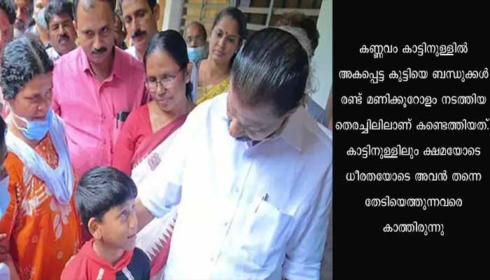 കണ്ണൂര്‍ : കണ്ണൂരില്‍ കണ്ണവം കാടിനുള്ളില്‍ കാണാതായി പിന്നീട് കണ്ടെത്തിയ കുഞ്ഞുമിടുക്കനെ ചേര്‍ത്ത് നിര്‍ത്തി മന്ത്രി എം വി ഗോവിന്ദന്‍. ഉരുള്‍ പൊട്ടുന്ന ശബ്ദം കേട്ടാണ് അര്‍ഷലെന്ന എട്ടുവയസ്സുകാരന്‍ വീട്ടില്‍ നിന്ന് ഇറങ്ങിയോടിയത്. ഓട്ടത്തില്‍ അവന്‍ തനിക്ക് സ്‌കൂളില്‍ നിന്ന് കിട്ടിയ ട്രോഫികളും കൈയ്യിലെടുത്തിരുന്നു.