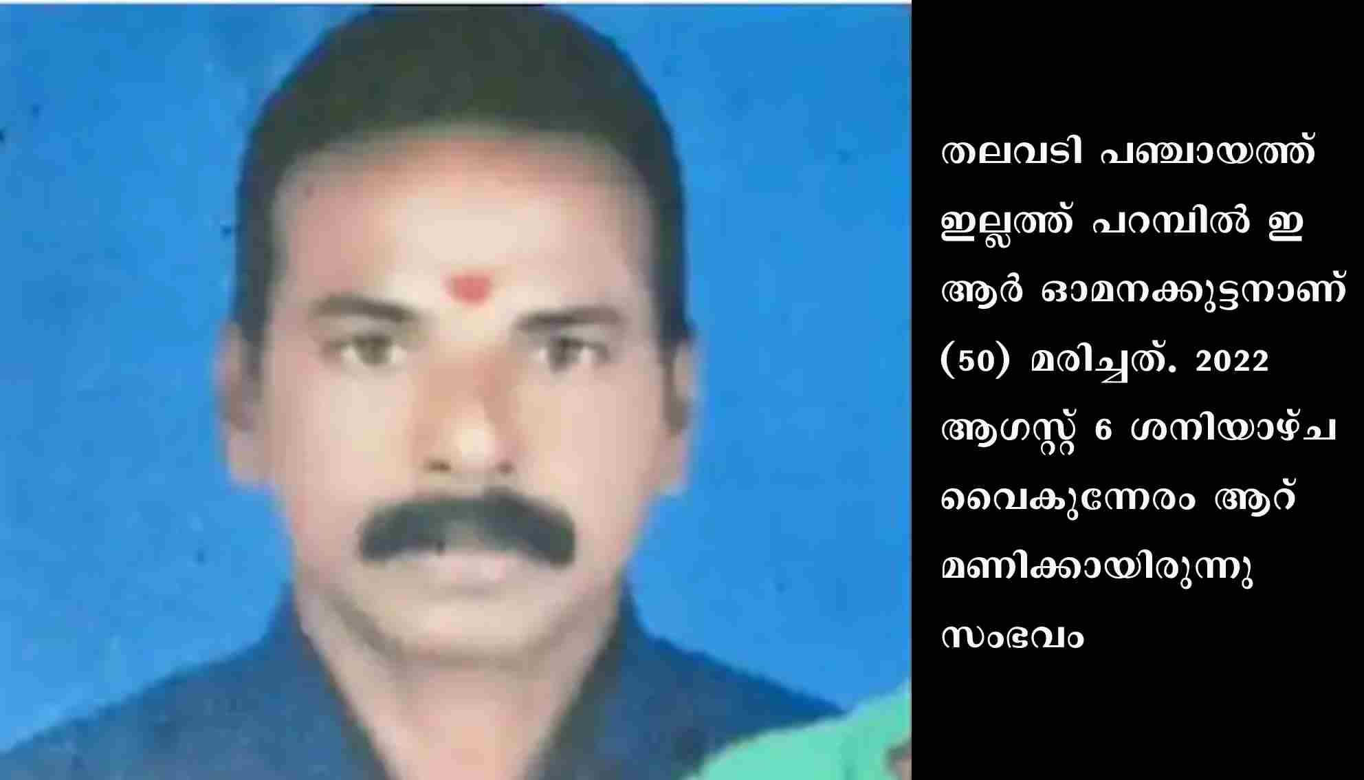എടത്വാ: ആശുപത്രിയിൽ എത്തിക്കാൻ വെള്ളക്കെട്ട് തടസ്സമായതിനെ തുടർന്ന് നെഞ്ചുവേദന മൂലം തൊഴിലാളി വഴിമദ്ധ്യേ മരിച്ചു. തലവടി പഞ്ചായത്ത് ഇല്ലത്ത് പറമ്പിൽ ഇ ആർ ഓമനക്കുട്ടനാണ് (50) മരിച്ചത്. 2022 ആഗസ്റ്റ് 6 ശനിയാഴ്ച വൈകുന്നേരം ആറ് മണിക്കായിരുന്നു സംഭവം. നെഞ്ച് വേദനയെ തുടർന്ന് വീട്ടുകാരും സമീപവാസികളും വള്ളത്തിൽ കയറ്റി കരയ്ക്കെത്തിച്ച ശേഷം കാറിൽ പരുമല സ്വകാര്യ ആശുപത്രിയിലേക്ക് കൊണ്ടുപോയെങ്കിലും വീട്ടിൽ നിന്ന് ഇറങ്ങുമ്പോഴുള്ള വെള്ളക്കെട്ട് കാരണം വേഗത്തിൽ ആശുപത്രിയിലെത്തിക്കാൻ തടസ്സമായി.