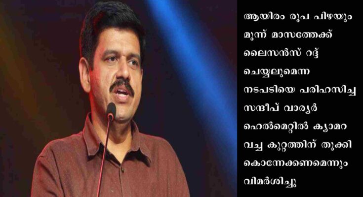 സന്ദീപ് വാര്യരുടെ ഫേസ്ബുക്ക് കുറിപ്പ് പൂർണ രൂപത്തിൽ : ആയിരം രൂപ പിഴയും മൂന്ന് മാസത്തേക്ക് ലൈസൻസ് റദ്ദ് ചെയ്യലും മാത്രം പോരാ സാർ , ഹെൽമെറ്റിൽ ക്യാമറ വച്ച കുറ്റത്തിന് തൂക്കി കൊന്നേക്കണം .. ഹെൽമെറ്റിൽ ക്യാമറ ഘടിപ്പിച്ചത് കൊണ്ട് എത്ര അപകടം വർദ്ധിച്ചു ? എന്ത് പഠനത്തിന്റെ അടിസ്ഥാനത്തിലാണ് ഈ തീരുമാനം ? ജനങ്ങളോടുള്ള സ്നേഹം കൊണ്ടൊന്നുമല്ല മറിച്ച് പലപ്പോഴും ഉദ്യോഗസ്ഥ ധാർഷ്ട്യത്തിനെതിരെയുള്ള തെളിവായി ക്യാമറ ഹെൽമെറ്റിലെ ദൃശ്യങ്ങൾ മാറുന്നതിനുള്ള അസഹിഷ്ണുതയാണ് ഈ തീരുമാനത്തിന് പിറകിൽ