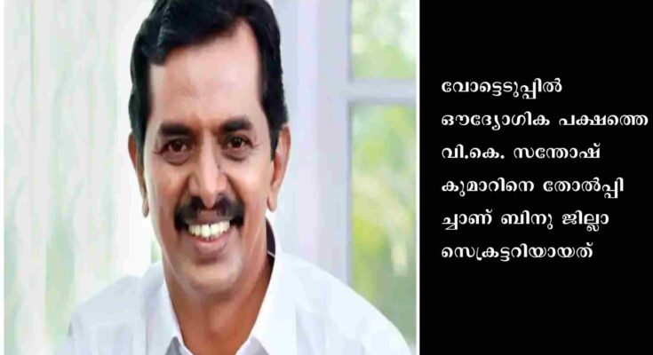 കോട്ടയം: സിപിഐ കോട്ടയം ജില്ലാ സെക്രട്ടറിയായി വി.ബി. ബിനു തിരഞ്ഞെടുക്കപ്പെട്ടു. വോട്ടെടുപ്പിൽ ഔദ്യോഗിക പക്ഷത്തെ വി.കെ. സന്തോഷ് കുമാറിനെ തോൽപ്പിച്ചാണ് ബിനു ജില്ലാ സെക്രട്ടറിയായത്. കെ ഇ ഇസ്മയിൽ പക്ഷക്കാരനാണ് ബിനു. 8 വോട്ടുകൾക്കാണ് ബിനുവിന്റെ വിജയം.