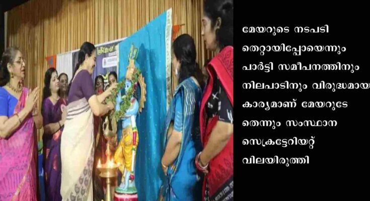 തിരുവനന്തപുരം: സംഘപരിവാർ സംഘടനയായ ബാലഗോകുലത്തിന്റെ പരിപാടിയിൽ പങ്കെടുത്ത കോഴിക്കോട് മേയർ ബീന ഫിലിപ്പിന്റെ നടപടിയിൽ അതൃപ്തി രേഖപ്പെടുത്തി സിപിഎം സംസ്ഥാന സെക്രട്ടേറിയറ്റ്. ഇക്കാര്യത്തിൽ ഉചിതമായ നടപടിയെടുക്കാൻ സിപിഎം ജില്ലാ ഘടകത്തെ പാർട്ടി ചുമതലപ്പെടുത്തി. മേയറുടെ നടപടി തെറ്റായിപ്പോയെന്നും പാർട്ടി സമീപനത്തിനും നിലപാടിനും വിരുദ്ധമായ കാര്യമാണ് മേയറുടേതെന്നും സംസ്ഥാന സെക്രട്ടേറിയറ്റ് വിലയിരുത്തി.