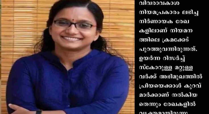 വിവരാവകാശ നിയമപ്രകാരം ലഭിച്ച നിർണായക രേഖകളിലാണ് നിയമനത്തിലെ ക്രമക്കേട് പുറത്തുവന്നിരുന്നത്. അഭിമുഖത്തിൽ പങ്കെടുത്ത ആറുപേരിൽ ഗവേഷണ പ്രസിദ്ധീകരണങ്ങൾക്കുള്ള റിസർച്ച് സ്കോർ ഏറ്റവും കൂടുതലുള്ളത് ജോസഫ് സ്കറിയ എന്നയാൾക്കാണ്, 651 പോയന്റ്. പ്രിയ വർഗീസിനുള്ളത് 156 പോയന്റ് മാത്രമാണെന്നും രേഖകളിൽ പറയുന്നു. അഭിമുഖത്തിൽ ഏറ്റവും കൂടുതൽ മാർക്ക് പ്രിയയ്ക്കാണ്. ഉയർന്ന റിസർച്ച് സ്കോറുള്ള മറ്റുള്ളവർക്ക് അഭിമുഖത്തിൽ പ്രിയയെക്കാൾ കുറവ് മാർക്കാണ് നൽകിയതെന്നും രേഖകളിൽ വ്യക്തമായിരുന്നു. ഇതുസംബന്ധിച്ച വിവരാവകാശ രേഖകൾ സേവ് യൂണിവേഴ്സിറ്റി ക്യാമ്പെയിൻ കമ്മിറ്റി ഗവർണർക്ക് സമർപ്പിച്ചിട്ടുണ്ട്.