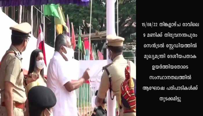 തിരുവനന്തപുരം: രാജ്യത്തിന്റെ 75ാം സ്വാതന്ത്ര്യദിനാഘോഷം പ്രൗഢഗംഭീരമാക്കി കേരളവും. 15/08/22 തിങ്കളാഴ്ച രാവിലെ 9 മണിക്ക് തിരുവനന്തപുരം സെൻട്രൽ സ്റ്റേഡിയത്തിൽ മുഖ്യമന്ത്രി ദേശീയപതാക ഉയർത്തിയതോടെ സംസ്ഥാനതലത്തിൽ ആഘോഷ പരിപാടികൾക്ക് തുടക്കമിട്ടു. തുടർന്ന് നടന്ന സ്വാതന്ത്ര്യദിന പരേഡിൽ മുഖ്യമന്ത്രി വിവിധ സേന വിഭാഗങ്ങളുടെ ഗാർഡ് ഓഫ് ഓണർ സ്വീകരിച്ചു. ജില്ലാ ആസ്ഥാനങ്ങളിൽ മന്ത്രിമാർ ആഘോഷ പരിപാടികൾക്ക് നേതൃത്വം നൽകും. ഗവർണർ ആരിഫ് മുഹമ്മദ് ഖാൻ രാജ് ഭവനിലും, സ്പീക്കർ നിയമസഭയിലും ദേശീയ പതാക ഉയർത്തി. ഇന്ദിരാഭവനിൽ കെ. സുധാകരനും, എകെജി സെന്ററിൽ മുതിർന്ന സിപിഐഎം നേതാവ് രാമചന്ദ്രൻ പിള്ളയും പതാക ഉയർത്തി ആഘോഷ പരിപാടികൾ ഉദ്ഘാടനം ചെയ്തു.