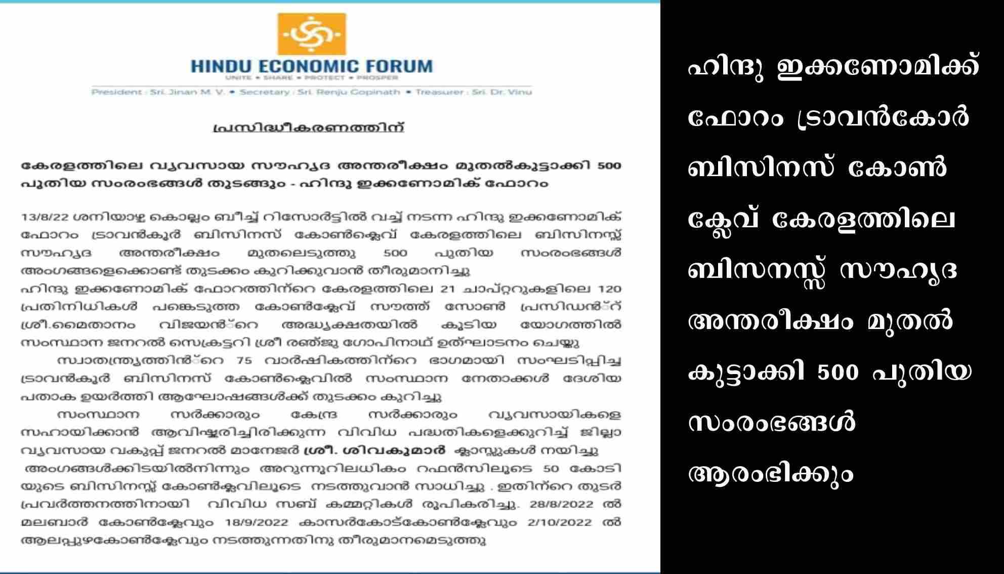 കൊല്ലം : ഹിന്ദു ഇക്കണോമിക്ക് ഫോറം ട്രാവൻകോർ ബിസിനസ് കോൺക്ലേവ് കേരളത്തിലെ ബിസനസ്സ് സൗഹൃദ അന്തരീക്ഷംമുതൽകുട്ടാക്കി 500 പുതിയ സംരംഭങ്ങൾ ആരംഭിക്കും. കൊല്ലം ബീച്ച്റിസോർട്ടിൽ വച്ചു നടന്ന ഹിന്ദു ഇക്കണോമിക് ഫോറത്തിന്റെ കേരളത്തിലെ 21 ചാപ്റ്ററുകളിലെ 120 പ്രതിനിധികൾ പങ്കെടുത്ത സൗത്ത്സോൺ കോൺക്ലേവ് സൗത്ത് സോൺ പ്രസിഡന്റ് മൈതാനം വിജയന്റെ അദ്ധ്യക്ഷതയിൽ കൂടിയ യോഗത്തിൽ സംസ്ഥാന ജനറൽ സെക്രട്ടറി രഞ്ജു സഗാപിനാഥ് ഉദ്ഘാടനം ചെയ്തു.