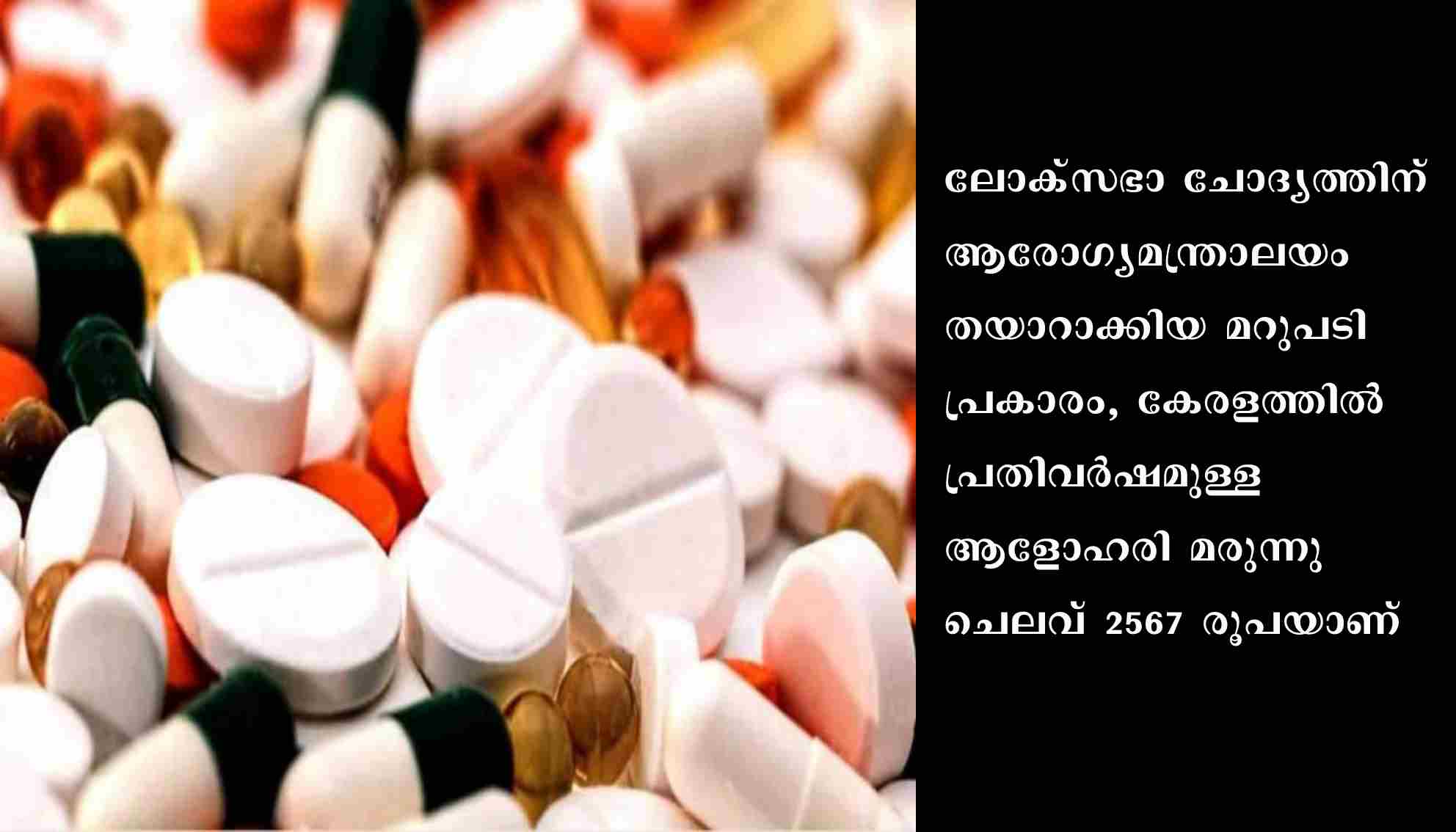 ന്യൂഡൽഹി : ഇന്ത്യയിൽ ഏറ്റവും കൂടുതൽ മരുന്നു കഴിക്കുന്ന സംസ്ഥാനം കേരളമെന്ന് ആരോഗ്യമന്ത്രാലയം. ലോക്സഭാ ചോദ്യത്തിന് ആരോഗ്യമന്ത്രാലയം തയാറാക്കിയ മറുപടി പ്രകാരം, കേരളത്തിൽ പ്രതിവർഷമുള്ള ആളോഹരി മരുന്നു ചെലവ് 2567 രൂപയാണ്. ഇതിൽ, 88.43% ഡോക്ടർമാർ കുറിച്ചു നൽകുന്നതാണെന്നും മറുപടിയിലുണ്ട്. ഡോക്ടറുടെ കുറിപ്പടിയില്ലാതെ കൗണ്ടറിൽ നിന്നു നേരിട്ടു വാങ്ങുന്നത് 11.57%.