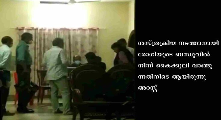 കോട്ടയം: ഡോക്ടർ കൈക്കൂലി വാങ്ങുന്നതിനിടെ അറസ്റ്റിൽ .കാഞ്ഞിരപ്പള്ളി താലൂക്ക് ആശുപത്രിയിലെ സർജൻ ഡോക്ടർ എം.എസ്.സുജിത് കുമാറാണ് വിജിലൻസിന്റെ പിടിയിലായത്. ശസ്ത്രക്രിയ നടത്താനായി രോഗിയുടെ ബന്ധുവിൽ നിന്ന് കൈക്കൂലി വാങ്ങുന്നതിനിടെ ആയിരുന്നു അറസ്റ്റ്. മുണ്ടക്കയം സ്വദേശിയായ രോഗിയ്ക്ക് ഹെർണിയ ശസ്ത്രക്രിയ നടത്താനാണ് സുജിത് കുമാർ അയ്യായിരം രൂപ കൈക്കൂലി ആവശ്യപ്പെട്ടത്. ആദ്യ ഗഡുവായി ഈ മാസം പതിനഞ്ചിന് രണ്ടായിരം രൂപ വാങ്ങി. തുടർന്ന് പതിനെട്ടാം തീയതി ശസ്ത്രക്രിയ നടത്തി.