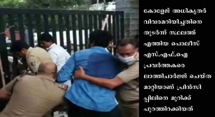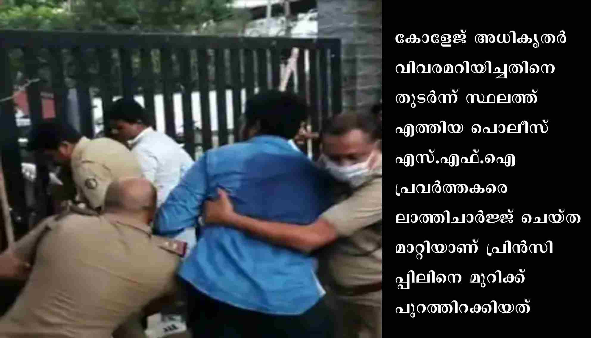 എന്നാൽ അച്ചടക്ക നടപടി നേരിട്ട വിദ്യാർത്ഥിക്ക് വീണ്ടും കോളജിൽ അഡ്മിനഷൻ നൽകാനാവില്ലെന്ന് കോളജ് കൗൺസിൽ തീരുമാനിച്ചു. തുടർന്നാണ് എസ്എഫ്ഐ പ്രവർത്തകർ പ്രവർത്തകർ പ്രിൻസിപ്പലിനെ മുറി പൂട്ടിയിട്ട് ഉപരോധിച്ചത്. കോളജിൻെറ പ്രധാന ഗേറ്റും എസ്എഫ്ഐക്കാർ പൂട്ടിയിട്ടു. പൊലീസ് വാഹനത്തിൽ പ്രിൻസിപ്പലിനെ പുറത്തേക്ക് കൊണ്ടുപോകാൻ ശ്രമിച്ചതും എസ്എഫ്ഐക്കാർ തടഞ്ഞു.