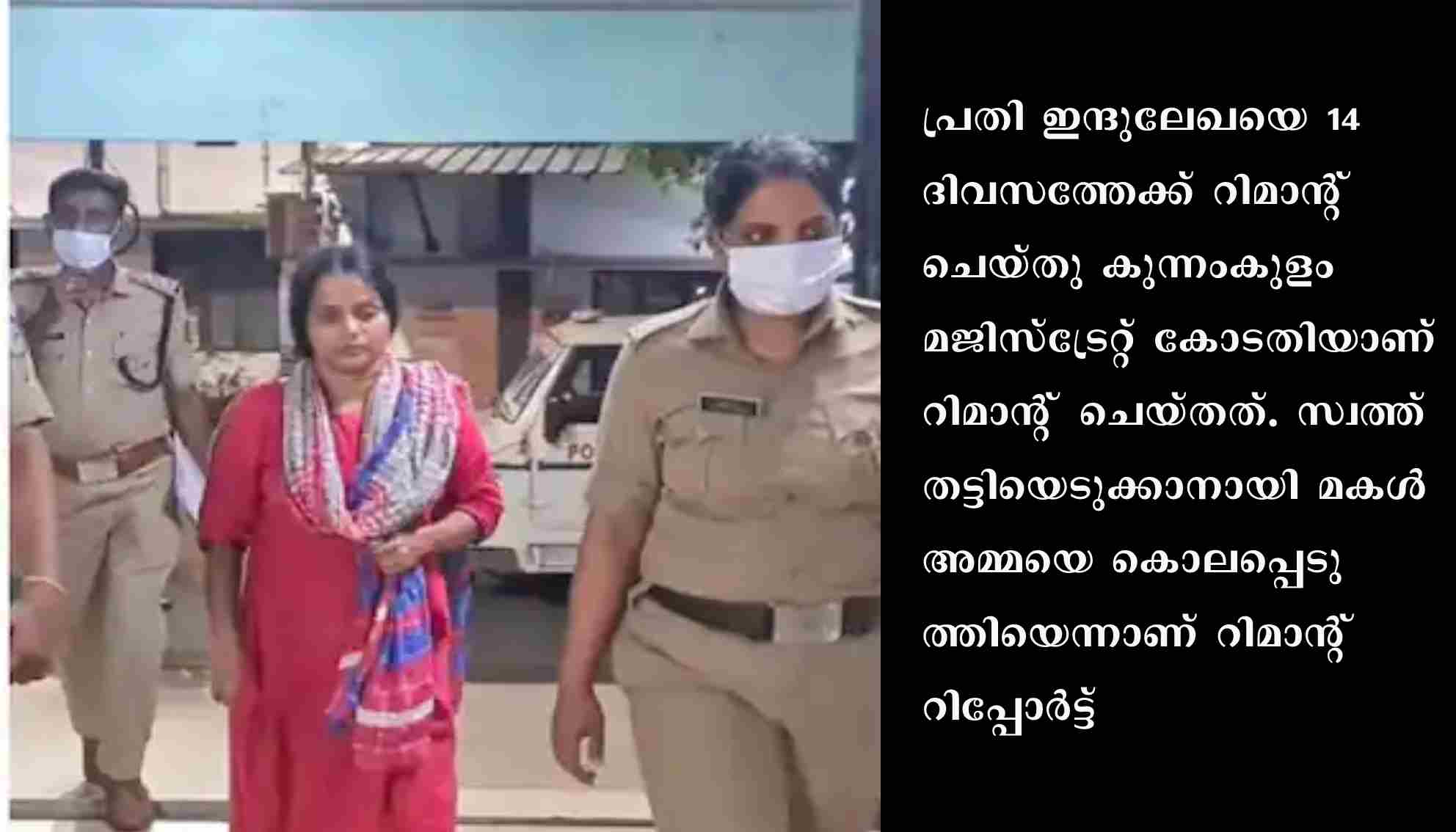തൃശ്ശൂർ: കുന്നംകുളം കിഴൂരിൽ അമ്മയെ കൊന്നത് സ്വത്ത് തട്ടിയെടുക്കാനെന്ന് റിമാന്റ് റിപ്പോർട്ട്. പ്രതി ഇന്ദുലേഖയെ 14 ദിവസത്തേക്ക് റിമാന്റ് ചെയ്തു കുന്നംകുളം മജിസ്ട്രേറ്റ് കോടതിയാണ് റിമാന്റ് ചെയ്തത്. സ്വത്ത് തട്ടിയെടുക്കാനായി മകൾ അമ്മയെ കൊലപ്പെടുത്തിയെന്നാണ് റിമാന്റ് റിപ്പോർട്ട്. സ്വത്തിന്റെ അവകാശികളിലൊരാളായ അമ്മയെ കൊലപ്പെടുത്തിയാൽ വേഗത്തിൽ സ്വത്ത് കൈക്കലാക്കാമെന്ന് മകൾ കരുതി. പ്രതിക്കായി അടുത്ത ദിവസങ്ങളിൽ കസ്റ്റഡി അപേക്ഷ നൽകുമെന്ന് അന്വേഷണ സംഘം പറഞ്ഞു.