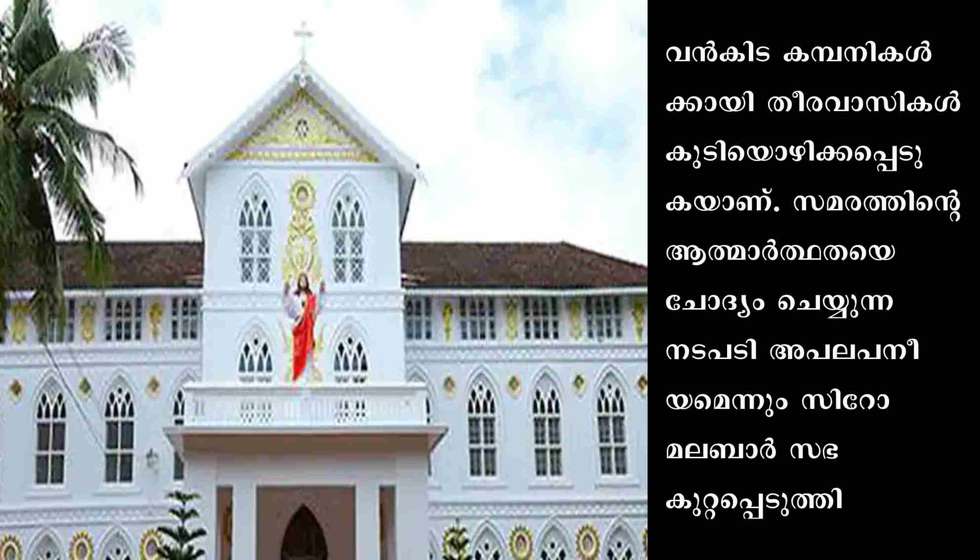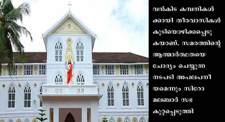 കൊച്ചി : വിഴിഞ്ഞം സമരത്തിന് സിറോ മലബാർ സഭ സിനിഡ് പൂർണ്ണ ഐക്യദാർഢ്യം പ്രഖ്യാപിച്ചു. വൻകിട കമ്പനികൾക്കായി തീരവാസികൾ കുടിയൊഴിക്കപ്പെടുകയാണ്. സമരത്തിന്റെ ആത്മാർത്ഥതയെ ചോദ്യം ചെയ്യുന്ന നടപടി അപലപനീയമെന്നും സിറോ മലബാർ സഭ കുറ്റപ്പെടുത്തി. തീരദേശവാസികൾ കുടിയൊഴിക്കപ്പെടുകയാണ്. സമരത്തിന്റെ ആത്മാർത്ഥതയെ ചോദ്യംചെയ്യുന്ന നടപടി അപലപനീയമെന്നും സിറോ മലബാർ സഭ കുറ്റപ്പെടുത്തി