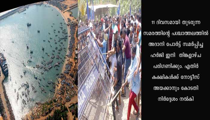 സമരം കാരണം വിഴിഞ്ഞം തുറമുഖ നിർമാണം നിലച്ചെന്നു അദാനിയുടെ അഭിഭാഷകന് ചൂണ്ടിക്കാട്ടി. പദ്ധതി സമയബന്ധിതമായി പൂർത്തിയാക്കേണ്ടതുണ്ട്. ദേശീയ പ്രാധാന്യം ഉള്ള പദ്ധതി 7 ദിവസമായി മുടങ്ങി നിൽക്കുകയാണ്. പ്രശ്നം പരിഹരിക്കാൻ എല്ലാ നടപടിയും സ്വീകരിക്കുന്നുണ്ടെന്ന് സർക്കാർ വ്യക്തമാക്കി. കേന്ദ്ര സർക്കാരിന് നോട്ടീസ് അയക്കേണ്ടതില്ലെന്നും സര്ക്കാര് അഭിഭാഷകന് ചൂണ്ടിക്കാട്ടി. CISF സുരക്ഷ ആവശ്യം ഇല്ല. പ്രശ്ന പരിഹാരത്തിനു സംസ്ഥാനവും കേന്ദ്രവും ശ്രമം നടത്തുന്നുണ്ട്. ക്രമസമാധാന പ്രശ്നം ഉണ്ടെങ്കിൽ സംസ്ഥാനം CISF സുരക്ഷ ആവശ്യപ്പെടണം എന്ന് കേന്ദ്ര സർക്കാർ വ്യക്തമാക്കി. പദ്ധതി തടസപ്പെടുത്തുന്നത് പൊതു താൽപര്യത്തിന് വിരുദ്ധമെന്ന് അദാനിപോര്ട്ട് ചൂണ്ടിക്കാട്ടി. ക്രമസമാധന പ്രശ്നം ഉണ്ടാകാതെ നോക്കണം എന്ന് ഹൈക്കോടതി നിർദേശം നല്കി. വിഴിഞ്ഞം പോലീസ് ഇത് ഉറപ്പാക്കണം. ഹർജി ഇനി29/08/22 തിങ്കളാഴ്ച പരിഗണിക്കും. എതിർകക്ഷികൾക്ക് നോട്ടീസ് അയക്കാനും കോടതി നിര്ദ്ദേശം നല്കി.