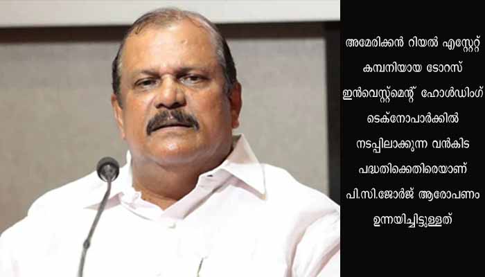അമേരിക്കൻ റിയൽ എസ്റ്റേറ്റ് കമ്പനിയായ ടോറസ് ഇൻവെസ്റ്റ്മെന്റ് ഹോൾഡിംഗ് ടെക്നോപാർക്കിൽ നടപ്പിലാക്കുന്ന വൻകിട പദ്ധതിക്കെതിരെയാണ് പി.സി.ജോർജ്ജ് ആരോപണം ഉന്നയിച്ചിട്ടുള്ളത്. ടോറസ് രാജ്യത്ത് ആദ്യമായി നടത്തുന്ന റിയൽ എസ്റ്റേറ്റ് നിക്ഷേപമാണ് ടെക്നോപാർക്കിലെ ടോറസ് ഡൗൺ ടൗൺ. ഐടി ഇടം, മാൾ, റസിഡൻഷ്യൽ സമുച്ചയം, ഹോട്ടൽ എന്നിവ ഉൾപ്പെടുന്ന ബൃഹത്തായ പദ്ധതിയാണ് ഇത്. 20 ലക്ഷം ചതുരശ്ര അടിയിൽ ഐടി വിഭാഗവും 13 ലക്ഷം ചതുരശ്ര അടി വിസ്തീർണത്തിൽ ടോറസ് സെൻട്രം ഷോപ്പിംഗ് മാളും ഒരുക്കാനാണ് നീക്കം.