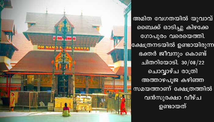 കിഴക്കേ നടയിൽ നിന്നും ബൈക്ക് അമിതവേഗത്തിൽ സത്രം ഗേറ്റ് കടന്ന് ദീപസ്തംഭം വരെ എത്തി. അവിടെ ബാരിക്കേഡ് കണ്ടതിനാൽ നേരെ തെക്കേ നടപന്തലിലേക്ക് തിരിഞ്ഞു. തെക്കേ നടപന്തലിലെ ഗേറ്റ് അടഞ്ഞു കിടക്കുന്നത് കണ്ട യുവാവ് വാഹനം വെട്ടിച്ചു കൂവളത്തിന് സമീപത്തുകൂടെ പടിഞ്ഞാറ് നടയിൽ എത്തി. അവിടെ നിന്നും പടിഞ്ഞാറെ നടപന്തലിലൂടെ പാഞ്ഞെങ്കിലും പന്തലിന്റെ പടിഞ്ഞാറെ അറ്റത്തുള്ള ബാരിക്കേഡ് കാരണം പുറത്തേക്ക് കടക്കാൻ കഴിഞ്ഞില്ല. അപ്പോഴേക്കും ഓടിയെത്തിയ ക്ഷേത്രം സെക്യൂരിറ്റിക്കാരും പോലീസും ചേർന്ന് യുവാവിനെ പിടികൂടി.
