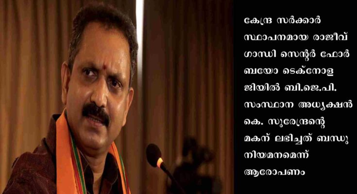 രാജീവ് ഗാന്ധി സെന്റര് ഫോര് ബയോ ടെക്നോളജിയില് ഒരു തസ്തിക പ്രത്യേകമായി ഉണ്ടാക്കി സുരേന്ദ്രന്റെ മകനായ കെ.എസ്. ഹരികൃഷ്ണനെ നിയമിക്കുകയായിരുന്നുവെന്നാണ് ആരോപണം ഉയര്ന്നത്.