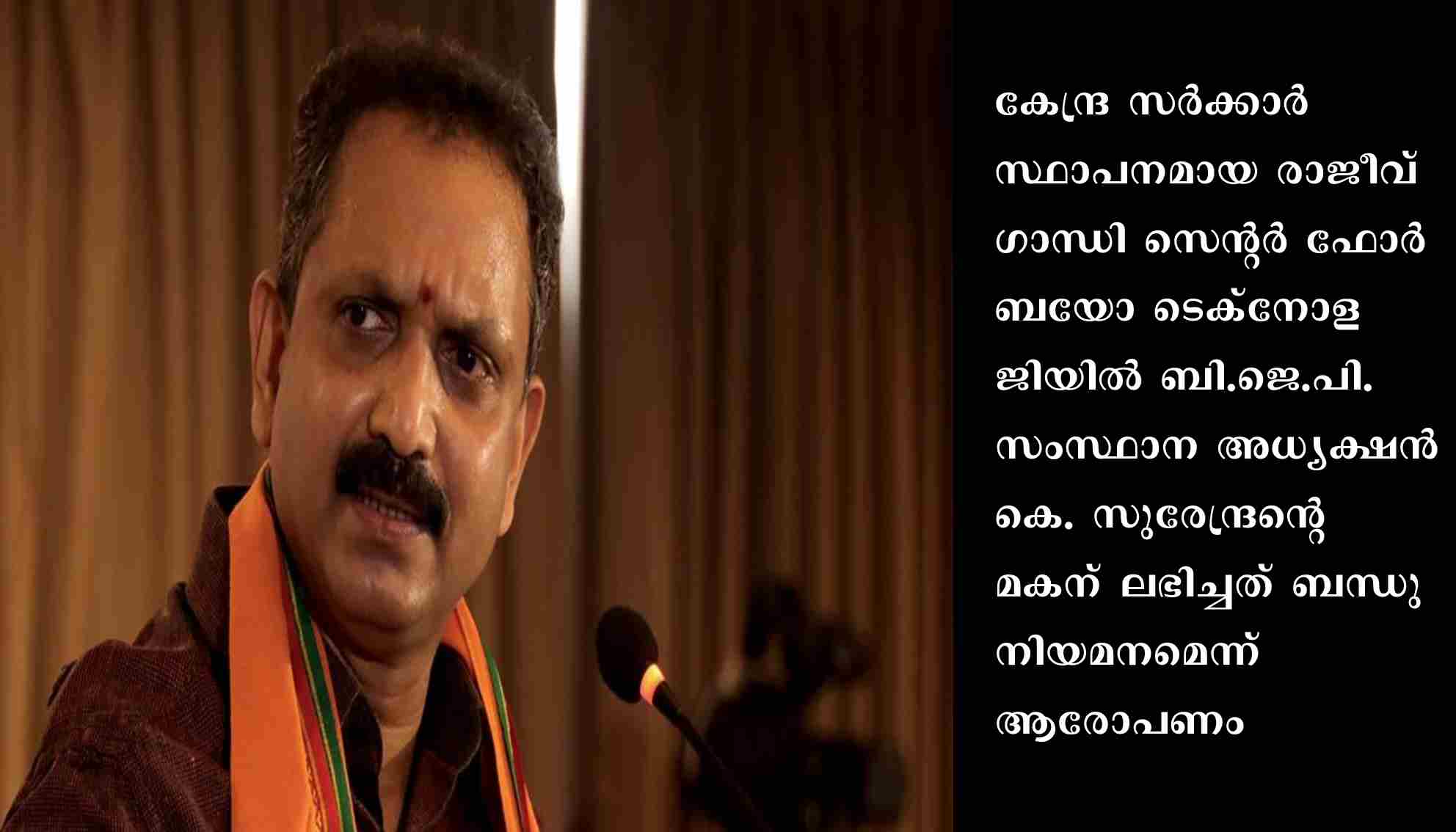 രാജീവ് ഗാന്ധി സെന്റര് ഫോര് ബയോ ടെക്നോളജിയില് ഒരു തസ്തിക പ്രത്യേകമായി ഉണ്ടാക്കി സുരേന്ദ്രന്റെ മകനായ കെ.എസ്. ഹരികൃഷ്ണനെ നിയമിക്കുകയായിരുന്നുവെന്നാണ് ആരോപണം ഉയര്ന്നത്.