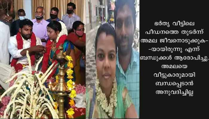 അമലയെ മാനസികമായി പീഡിപ്പിച്ചു എന്ന് കാട്ടി ബന്ധുക്കൾ പൊലീസിൽ പരാതി നൽകിയുിട്ടുണ്ട്. സംഭവത്തിൽ അസ്വഭാവിക മരണത്തിന് പൊലീസ് കേസെടുത്തു. രണ്ട് വർഷം മുമ്പാണ് അമല വടക്കൻ പറവൂർ സ്വദേശിയായ രഞ്ജിത്തിനെ വിവാഹം കഴിച്ചത്.