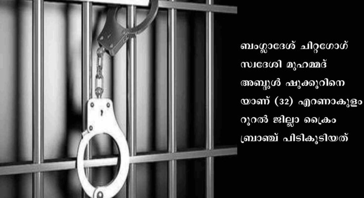 നെടുമ്പാശേരി വിമാനത്താവളം വഴി വ്യാജരേഖകളുമായി ഷാര്ജയിലേക്ക് കടക്കാന് ശ്രമിച്ച 4 ബംഗ്ലാദേശികളെ ഓഗസ്റ്റ് 27 ന് അറസ്റ്റ് ചെയ്തിരുന്നു. ഇന്ത്യക്കാരെന്ന വ്യാജേനയാണ് ഇവര് പോകാന് ശ്രമിച്ചത്. ജില്ലാ പോലീസ് മേധാവി വിവേക് കുമാറിന്റെ നേതൃത്വത്തില് ജില്ലാ ക്രൈംബ്രാഞ്ച് ഇതേക്കുറിച്ചു നടത്തിയ അന്വേഷണത്തില് വ്യാജരേഖകള് തയ്യാറാക്കി നല്കുന്ന റാക്കറ്റിനെക്കുറിച്ചു വിവരം ലഭിച്ചിരുന്നു. ഈ സംഘത്തിലെ പ്രധാന ഏജന്റാണ് അബ്ദുള് ഷുക്കൂര്. മംഗലാപുരം വിമാനത്താവളം വഴി രണ്ടുപേരെ വിദേശത്തേക്കു കടത്താന് കൊണ്ടുവരുമ്പോഴാണ് ഇയാളെ പോലീസ് പിടികൂടിയത്. ബംഗ്ലാദേശില്നിന്ന് ഇന്ത്യയിലേക്ക് ആളുകളെ കൊണ്ടുവന്ന് പാസ്പോര്ട്ട് ഉള്പ്പെടെയുള്ള രേഖകള് തയാറാക്കി നല്കി മനുഷ്യക്കടത്ത് നടത്തുകയാണ് ഇയാള് ചെയ്യുന്നത്.ഡി.െവെ.എസ്.പി: വി. രാജീവ്, എസ്.ഐ: ടി.എം.സൂഫി, എ.എസ്.ഐ: സി.ഡി. സാബു, എസ്.സി.പി.ഒ. ലിജോ ജേക്കബ് തുടങ്ങിയവരാണ് അന്വേഷണ സംഘത്തിലുള്ളത്.