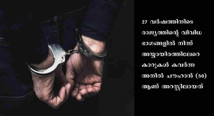 ന്യൂഡല്‍ഹി: രാജ്യത്തെ ഏറ്റവും വലിയ കാര്‍ മോഷ്ടാവ് ഒടുവില്‍ പോലീസ് വലയില്‍ കുടുങ്ങി. 27 വര്‍ഷത്തിനിടെ രാജ്യത്തിന്റെ വിവിധ ഭാഗങ്ങളില്‍ നിന്ന് അയ്യായിരത്തിലേറെ കാറുകള്‍ കവര്‍ന്ന അനില്‍ ചൗഹാന്‍ (50) ആണ് അറസ്റ്റിലായത്. ആഢംബര ജീവിതത്തിനായാണ് ഇയാള്‍ മോഷണങ്ങള്‍ നടത്തിയിരുന്നതെന്നു പോലീസ് പറഞ്ഞു.പലതവണ ടാക്സി ഡ്രൈവര്‍മാരെ കൊലപ്പെടുത്തിയും ഇയാള്‍ കാറുകള്‍ കവര്‍ന്നിട്ടുണ്ട്. നിരവധി കൊലപാതകക്കേസുകളില്‍ പ്രതിയായ ഇയാള്‍ക്ക് മൂന്നു ഭാര്യമാരും വടക്കു-കിഴക്കന്‍ സംസ്ഥാനങ്ങളിലും ഡല്‍ഹി, മുംബൈ എന്നിവിടങ്ങളിലും നിരവധി സ്വത്തുക്കളുമുണ്ട്. ഡല്‍ഹിയിലെ ദേശ്ബന്ധു ഗുപ്ത റോഡ് മേഖലയില്‍നിന്നാണ് ഡല്‍ഹി പോലീസ് സ്പെഷല്‍ സെല്‍ അനില്‍ ചൗഹാനെ പിടികൂടിയത്. ആറു പിസ്റ്റള്‍ ഉള്‍പ്പെടെയുള്ള ആയുധങ്ങളും ഇയാളില്‍നിന്നു പിടിച്ചെടുത്തു. ഡല്‍ഹി ഖാന്‍പുരില്‍ ഓട്ടോറിക്ഷാ ഡ്രൈവറായിരുന്ന ഇയാള്‍ 1995-ലാണ് കാര്‍ മോഷണം ആരംഭിച്ചത്. അക്കാലത്ത് മാരുതി 800 കാറുകള്‍ മോഷ്ടിച്ച് കുപ്രസിദ്ധനായി. രാജ്യത്തിന്റെ വിവിധ ഭാഗങ്ങളില്‍നിന്നു മോഷ്ടിക്കുന്ന കാറുകള്‍ നേപ്പാളിലേക്കും ജമ്മു കശ്മീര്‍, വടക്കുകിഴക്കന്‍ സംസ്ഥാനങ്ങള്‍ എന്നിവിടങ്ങളിലേക്കും കടത്തുകയായിരുന്നു പതിവ്.
