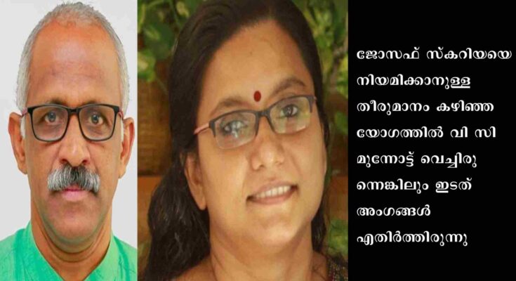 കണ്ണൂർ : പ്രിയാ വർഗീസിന്റെ കണ്ണൂർ സർവകാശാലയിലെ നിയമനത്തിന് എതിരെ പരാതി നൽകിയ ജോസഫ് സ്കറിയയയെ കാലിക്കറ്റ് യൂണിവേഴ്സിറ്റിയിൽ പ്രൊഫസർ തസ്തികയിൽ നിയമിക്കാനുള്ള നീക്കത്തിൽ നിന്നും വി.സി പിൻമാറി. സിൻഡിക്കറ്റ് യോഗത്തിലാണ് വി.സി ഇക്കാര്യം അറിയിച്ചത്. ജോസഫ് സ്കറിയയെ നിയമിക്കാനുള്ള തീരുമാനം കഴിഞ്ഞ യോഗത്തിൽ വി സി മുന്നോട്ട് വെച്ചിരുന്നെങ്കിലും ഇടത് അംഗങ്ങൾ എതിർത്തിരുന്നു