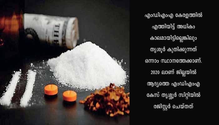 2022 ഓഗസ്റ്റ് വരെ 38 എംഡിഎംഎ (മെത്തലിൻ ഡയോക്സിൻ മെത്താ ഫെറ്റാമിൻ) കേസുകളാണ് പോലീസ് രജിസ്റ്റർ ചെയ്തത്. വിദ്യാർത്ഥിനികൾ അടക്കമുള്ള 50 പേർക്കെതിരെ കേസെടുത്തു. വിൽപ്പനക്കാരായ ഇവരിൽ പലരും മയക്കുമരുന്നിന് അടിമകളായിരുന്നു. നിരന്തര ഉപയോഗം മൂലം നിസ്സാര കാര്യങ്ങൾക്ക് പോലും ക്ഷുഭിതരായി പൊട്ടിത്തെറിക്കുന്ന സ്വഭാവ ദൂഷ്യം ഉള്ളവരായിരുന്നു ചിലർ. പിടിയിലായവരിൽ 90% പേരും പ്ലസ് ടു, പ്രൊഫഷണൽ വിദ്യാർഥികളാണ്. എംഡിഎംഎ കേരളത്തിൽ എത്തിയിട്ട് അധികം കാലമായിട്ടില്ലെങ്കിലും തൃശൂർ കുതിക്കുന്നത് ഒന്നാം സ്ഥാനത്തേക്കാണ്. 2020 ലാണ് ജില്ലയിൽ ആദ്യത്തെ എംഡിഎംഎ കേസ് തൃശ്ശൂർ സിറ്റിയിൽ രജിസ്റ്റർ ചെയ്തത്. അന്ന് അഞ്ചു ഗ്രാം ആണ് പിടികൂടിയത്. 2021ൽ 16 കേസുകളിലായി 38 പേർ അറസ്റ്റിലായി. 23 ഗ്രാം ആണ് ആ വർഷം പിടികൂടിയത് എന്നാൽ 2022 പകുതിയായപ്പോഴേക്കും എംഡി ഒരു കിലോയോളം പിടികൂടിയത് ഞെട്ടിപ്പിക്കുന്നതാണ്. കേരളത്തിൽ 6.7 കിലോഗ്രാം പിടിച്ചെടുത്തു.