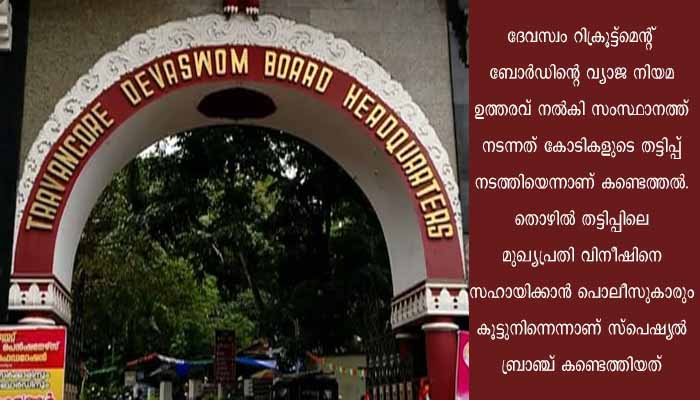 വൻ തട്ടിപ്പാണ് ദേവസ്വം റിക്രൂട്ട്മെന്റ് ബോർഡിന്റെ വ്യാജ രേഖകള്‍ ഉപയോഗിച്ച് നടന്നത്. വൈക്കം ക്ഷേത്രകലാപീഠത്തിൽ ക്ല‍ർക്ക് തസ്തികയിലേക്കുള്ള ദേവസ്വം റിക്രൂട്ട്മെന്റിന്റെ നിയമന ഉത്തരവുമായി യുവതി ബോർഡിനെ സമീപിച്ചപ്പോഴാണ് തട്ടിപ്പ് പുറത്തുവരുന്നത്. വ്യാജ നിയമന ഉത്തരവ് ശ്രദ്ധയിൽപ്പെട്ട ബോർഡ് ചെയർമാൻ രാജഗോപാലൻ നായർ 2022 മാ‍ർച്ച് 23 ന് ഡിജിപിക്ക് പരാതി നൽകി. പക്ഷെ മൂന്ന് മാസത്തിന് ശേഷം മാത്രമാണ് സംഭവത്തില്‍ പൊലീസ് അന്വേഷണം ആരംഭിക്കുന്നത്. മാത്രമല്ല തട്ടിപ്പിന്റെ മുഖ്യ സൂത്രധാരനായ മാവേലിക്കര സ്വദേശി വിനീഷിനെതിരെ കേസെടുത്തപ്പോൾ മാവേലിക്കര സ്റ്റേഷനിലെ ഗ്രേഡ് എസ്ഐ വിവരം ചോർത്തി നൽകുകയും ചെയ്തു.