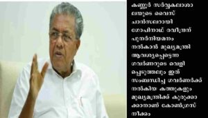കണ്ണൂർ സർവ്വകലാശാലയുടെ വൈസ് ചാൻസലറായി ഗോപിനാഥ് രവീന്ദ്രന് പുനർനിയമനം നൽകാൻ മുഖ്യമന്ത്രി ആവശ്യപ്പെട്ടെന്ന ഗവർണറുടെ വെളിപ്പെടുത്തലും ഇത് സംബന്ധിച്ച ഗവർണർക്ക് നൽകിയ കത്തുകളും മുഖ്യമന്ത്രിക്ക് കുരുക്കാക്കാനാണ് കോൺഗ്രസ് നീക്കം. മുഖ്യമന്ത്രി ഗവർണർക്ക് നൽകിയ കത്തിലും രവീന്ദ്രന്റെ പുനർനിയമന ആവശ്യം ഉന്നയിച്ചിട്ടുണ്ട്. ഇത് സത്യപ്രതിജ്ഞാ ലംഘനവും സ്വജന പക്ഷപാതവുമാണ്. അതിനാൽ മുഖ്യമന്ത്രിക്കെതിരെ പൊലീസ് കേസ് ചാർജ് ചെയ്ത് അന്വേഷണം നടത്തി ശിക്ഷിക്കണമെന്നാണ് കോൺഗ്രസ് നേതാവ് ജ്യോതികുമാർ ചാമക്കാലയുടെ ആവശ്യം