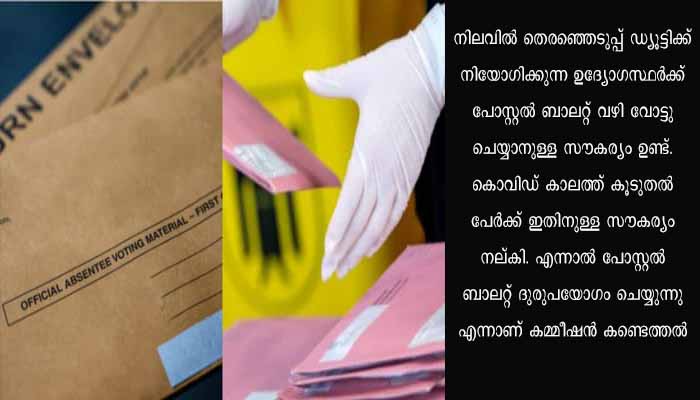 തെരഞ്ഞെടുപ്പ് നടപടികളിൽ വലിയൊരു മാറ്റത്തിനുള്ള നിർദ്ദേശമാണ് കമ്മീഷൻ നല്കിയിരിക്കുന്നത്. നിലവിൽ തെരഞ്ഞെടുപ്പ് ഡ്യൂട്ടിക്ക് നിയോഗിക്കുന്ന ഉദ്യോഗസ്ഥർക്ക് പോസ്റ്റൽ ബാലറ്റ് വഴി വോട്ടു ചെയ്യാനുള്ള സൗകര്യം ഉണ്ട്. കൊവിഡ് കാലത്ത് കൂടുതൽ പേർക്ക് ഇതിനുള്ള സൗകര്യം നല്കി. എന്നാൽ പോസ്റ്റൽ ബാലറ്റ് ദുരുപയോഗം ചെയ്യുന്നു എന്നാണ് കമ്മീഷൻ കണ്ടെത്തൽ. നിലവിൽ പോസ്റ്റൽ ബാലറ്റ് വാങ്ങി പ്രത്യേക കേന്ദ്രങ്ങളിൽ വോട്ടു ചെയ്ത് തിരികെ നല്കാനുള്ള സൗകര്യമുണ്ട്. എന്നാൽ പോസ്റ്റൽ ബാലറ്റ് വോട്ടെണ്ണൽ നടക്കുന്ന ദിവസം രാവിലെ തിരികെ എത്തിച്ചാൽ മതി എന്ന ചട്ടം നിലവിലുണ്ട്. ഈ ചട്ടം ദുരുപയോഗം ചെയ്യുന്നു എന്നാണ് കമ്മീഷൻ പറയുന്നത്.