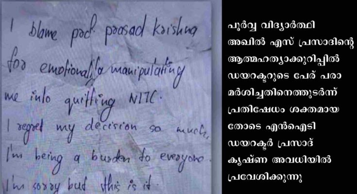 എൻഐടിയിലെ പഠനം ഉപേക്ഷിക്കാൻ പ്രൊഫ. പ്രസാദ് കൃഷ്ണ മാനസികമായി സമ്മർദം ചെലുത്തിയെന്നാണ് അഖിൽ ആത്മഹത്യാകുറിപ്പിൽ എഴുതിയിരിക്കുന്നത്. 2022 സെപ്തംബര് 20 ചൊവ്വാഴ്ച്ചയാണ് അഖിലിനെ ഹോസ്റ്റലിൽ തൂങ്ങി മരിച്ച നിലയിൽ കണ്ടെത്തിയത്. ജലന്ധറിലെ ലൌലി പ്രൊഫഷണൽ സർവകലാശാലയിലെ ഒന്നാം വർഷ ബിരുദ വിദ്യാർത്ഥിയാണ് അഖിൽ എസ് ദിലീപ്. ചേർത്തല പള്ളുരുത്തി സ്വദേശി ദിലീപിൻറെ മകനാണ് 21 വയസുകാരനായ അഖിൽ. മൃതദേഹത്തിന് സമീപം കണ്ടെത്തിയ കുറിപ്പിലാണ് പ്രൊഫ പ്രസാദ് കൃഷ്ണ എൻഐടിയിലെ പഠനം ഉപേക്ഷിക്കാൻ മാനസികമായി സമ്മർദ്ദം ചെലുത്തിയെന്ന് ആരോപിക്കുന്നത്. നേരത്തെ കോഴിക്കോട് എൻഐടിയിലെ ബിടെക് വിദ്യാർത്ഥിയായിരുന്നു അഖിൽ. പ്രൊഫ പ്രസാദ് കൃഷ്ണ ഡയറക്ടർ സ്ഥാനത്ത് നിന്നും മാറിനിൽക്കണം എന്നാവശ്യപ്പെട്ട് വൈകിട്ട് എസ്എഫ്ഐ കോഴിക്കോട് എൻഐടിയിലേക്ക് പ്രതിഷേധ മാർച്ച് നടത്തി.