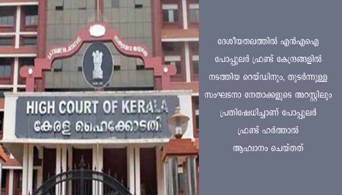 കൊച്ചി: പോപ്പുലർ ഫ്രണ്ട് ഹർത്താലിനെതിരെ ഹൈക്കോടതി സ്വമേധയാ കേസെടുത്തു. ഹർത്താലിലെ അക്രമസംഭവങ്ങൾ തടയാൻ സർക്കാർ അടിയന്തരമായി ഇടപെടണമെന്നും ഹൈക്കോടതി. ഹർത്താൽ കോടതി നിരോധിച്ചതാണെന്നും കോടതി വ്യക്തമാക്കി. ദേശീയതലത്തിൽ എൻ എ ഐ പോപ്പുലർ ഫ്രണ്ട് കേന്ദ്രങ്ങളിൽ നടത്തിയ റെയ്ഡിനും, തുടർന്നുള്ള സംഘടനാ നേതാക്കളുടെ അറസ്റ്റിലും പ്രതിഷേധിച്ചാണ് പോപ്പുലർ ഫ്രണ്ട് ഹർത്താൽ ആഹ്വാനം ചെയ്തത്.